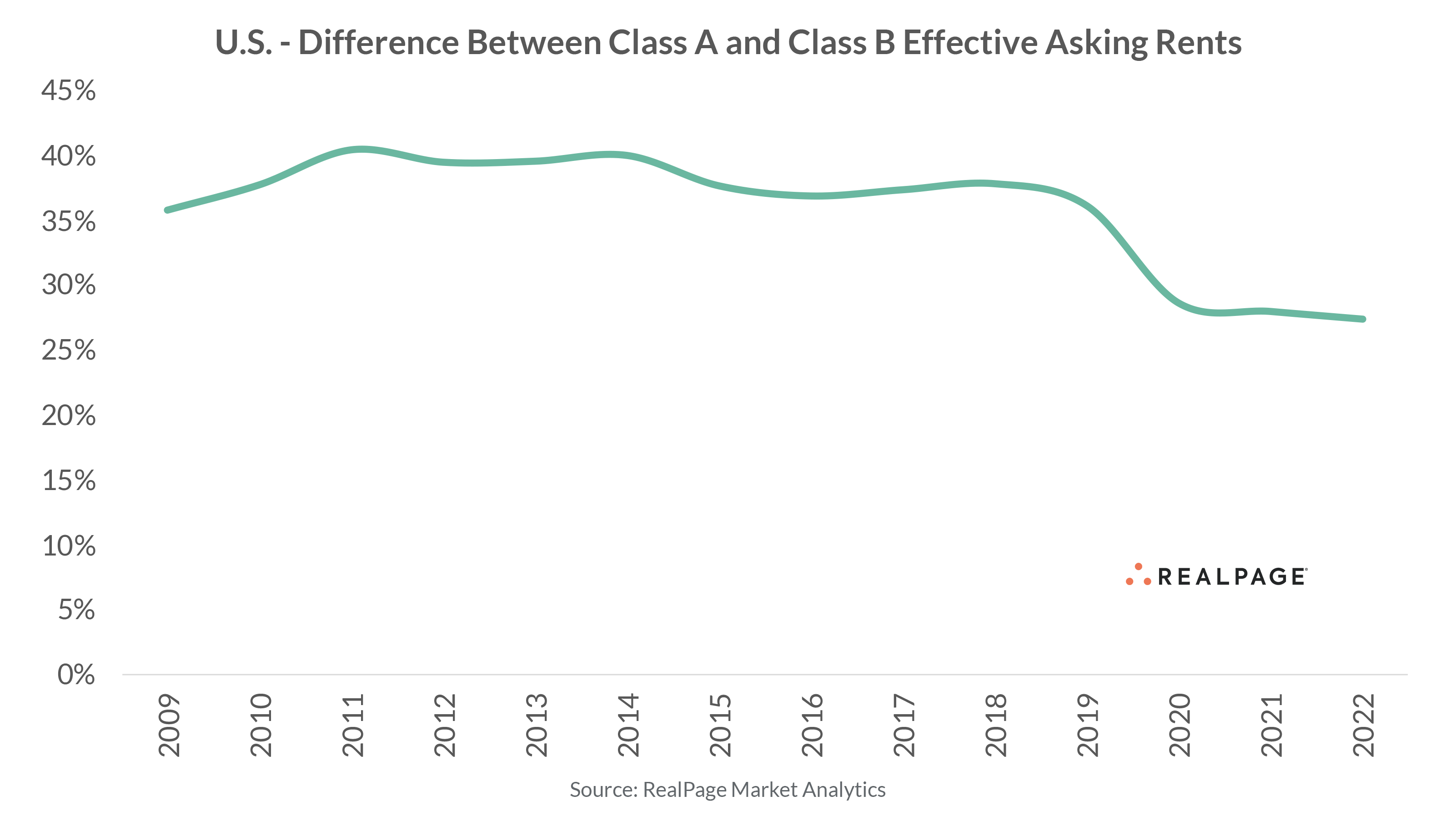 That difference between the average Class A property and the average Class B property equates to a significant $479 difference per month. Not only is that nominally large, but the difference between Class A rents and Class B rents comes out to a 28% premium.