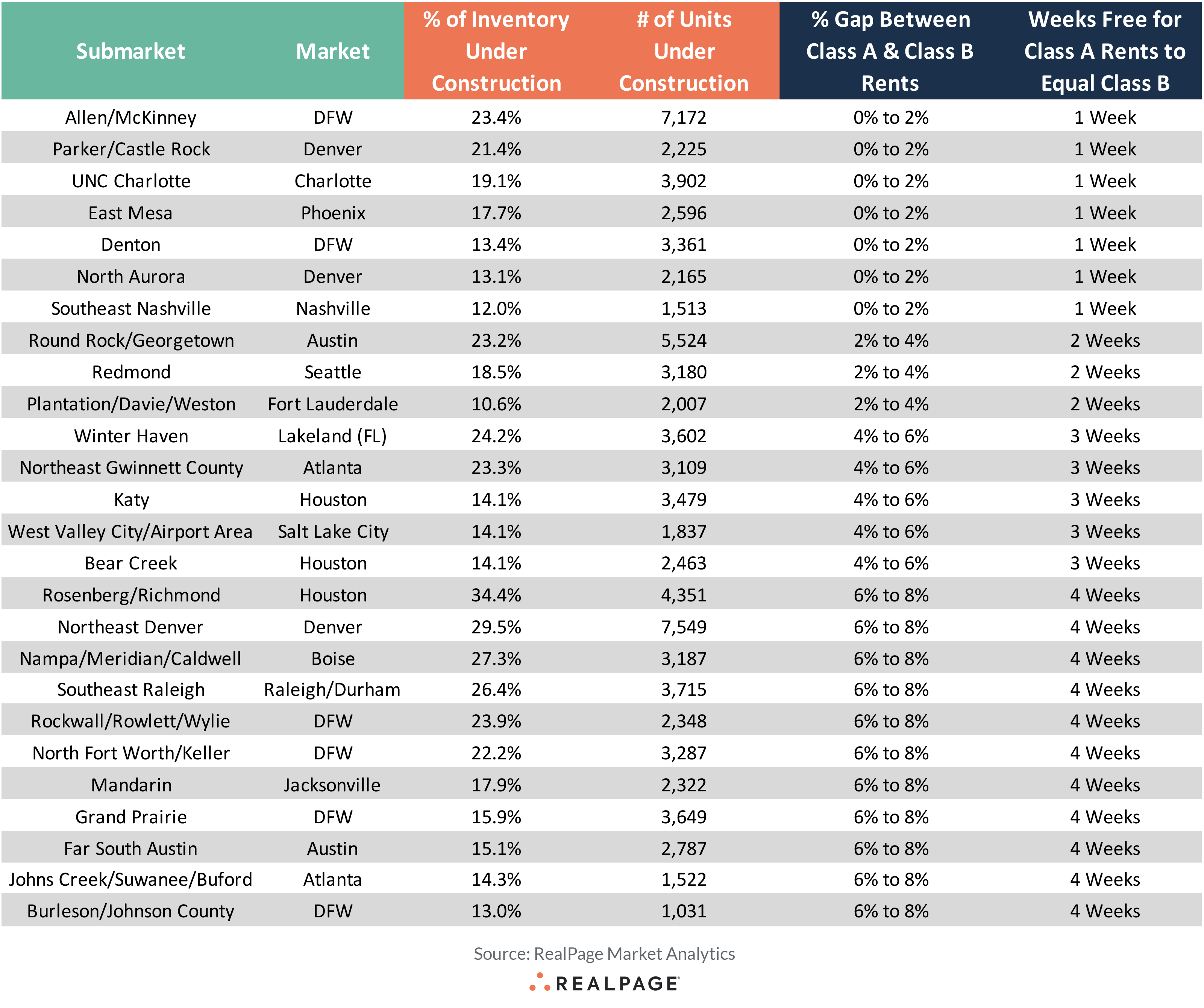 In these instances, just one to two months free among stabilized Class A assets would normalize rents with existing Class B stock. And with up to 25% to 30% of all existing stock underway in many of these neighborhoods, it’s certainly within the realm of possibility that those lease-up assets delivering could in fact result in deep concession among the local stabilized product.