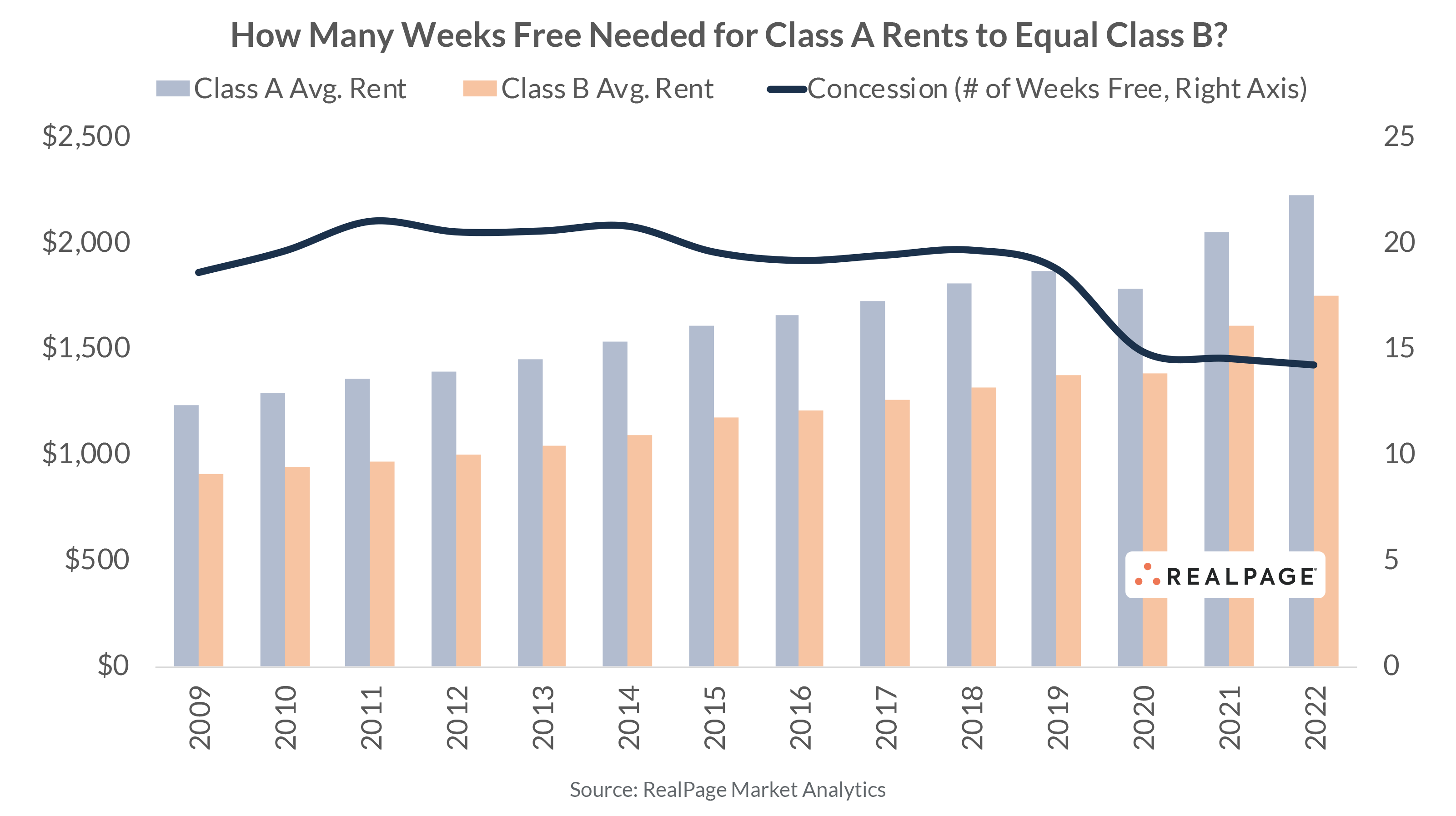 From that perspective, the investment thesis that Class B housing is insulated from Class A product holds largely true. All else being equal, the average Class A property would have to offer a substantial concession to pull a Class B household into the Class A product tranche.