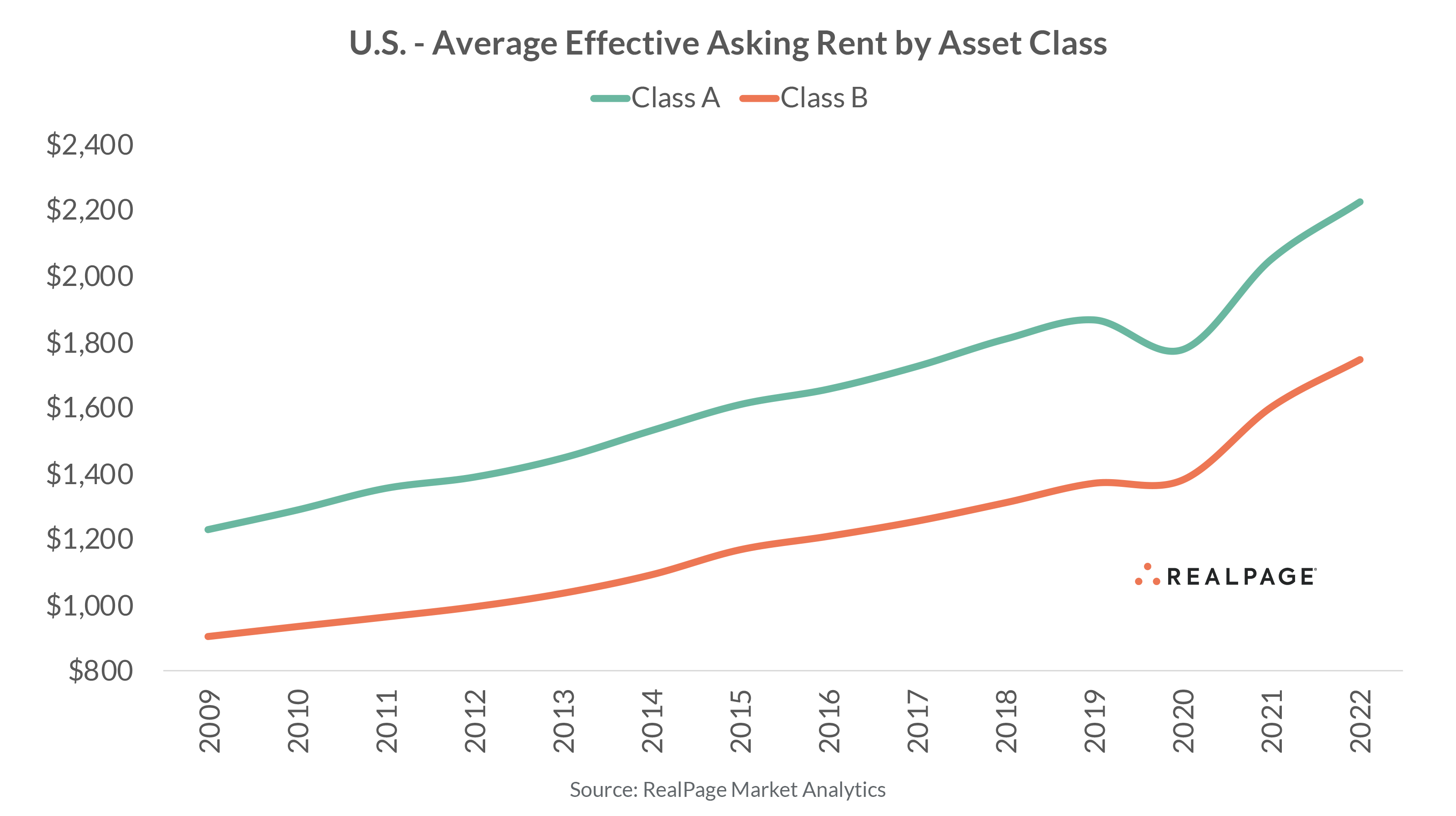 That difference between the average Class A property and the average Class B property equates to a significant $479 difference per month. Not only is that nominally large, but the difference between Class A rents and Class B rents comes out to a 28% premium.