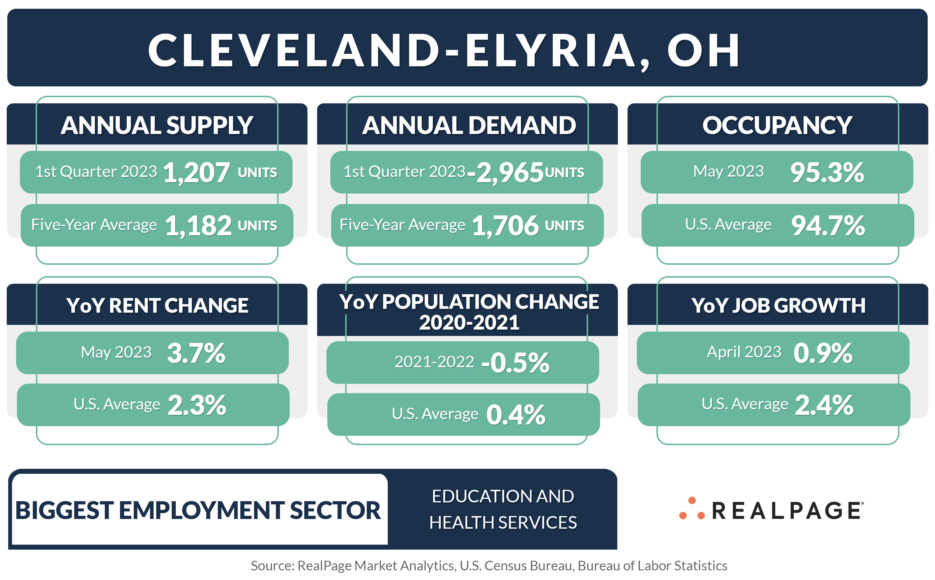 Over the past five years, demand in Cleveland generally exceeded limited new supply by an average of 44%. However, over the past four quarters, Cleveland has recorded declines in its occupied unit count. Most recently, in 1st quarter 2023, Cleveland recorded net move-outs from 591 units, taking the market’s occupied unit count down by nearly 3,000 units on an annual basis.