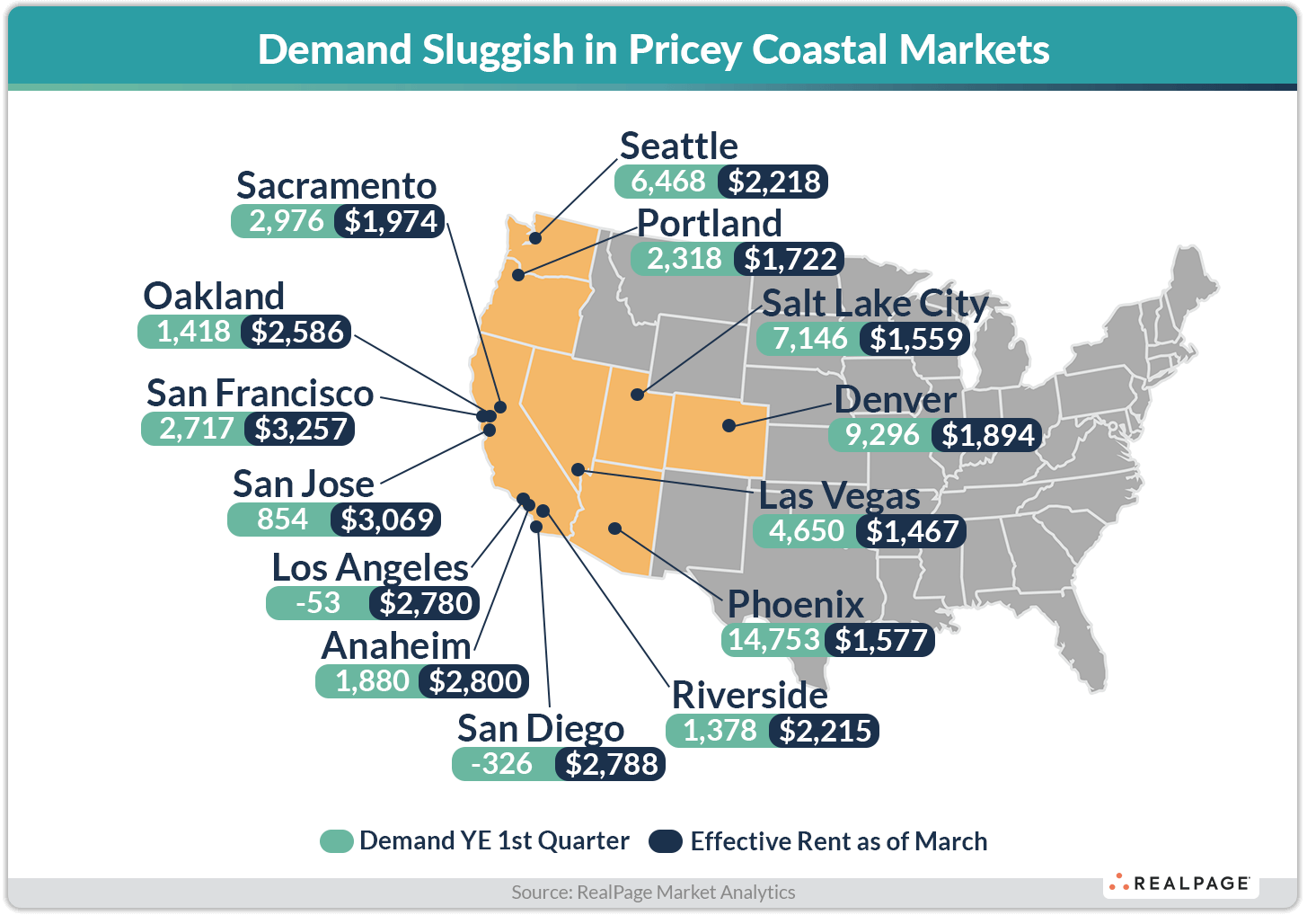 Overall, the West region of the U.S. logged apartment demand for roughly 69,000 units in the year-ending 1st quarter, according to data from RealPage Market Analytics. By comparison, that was less than half of what the South region logged for demand in that time frame.