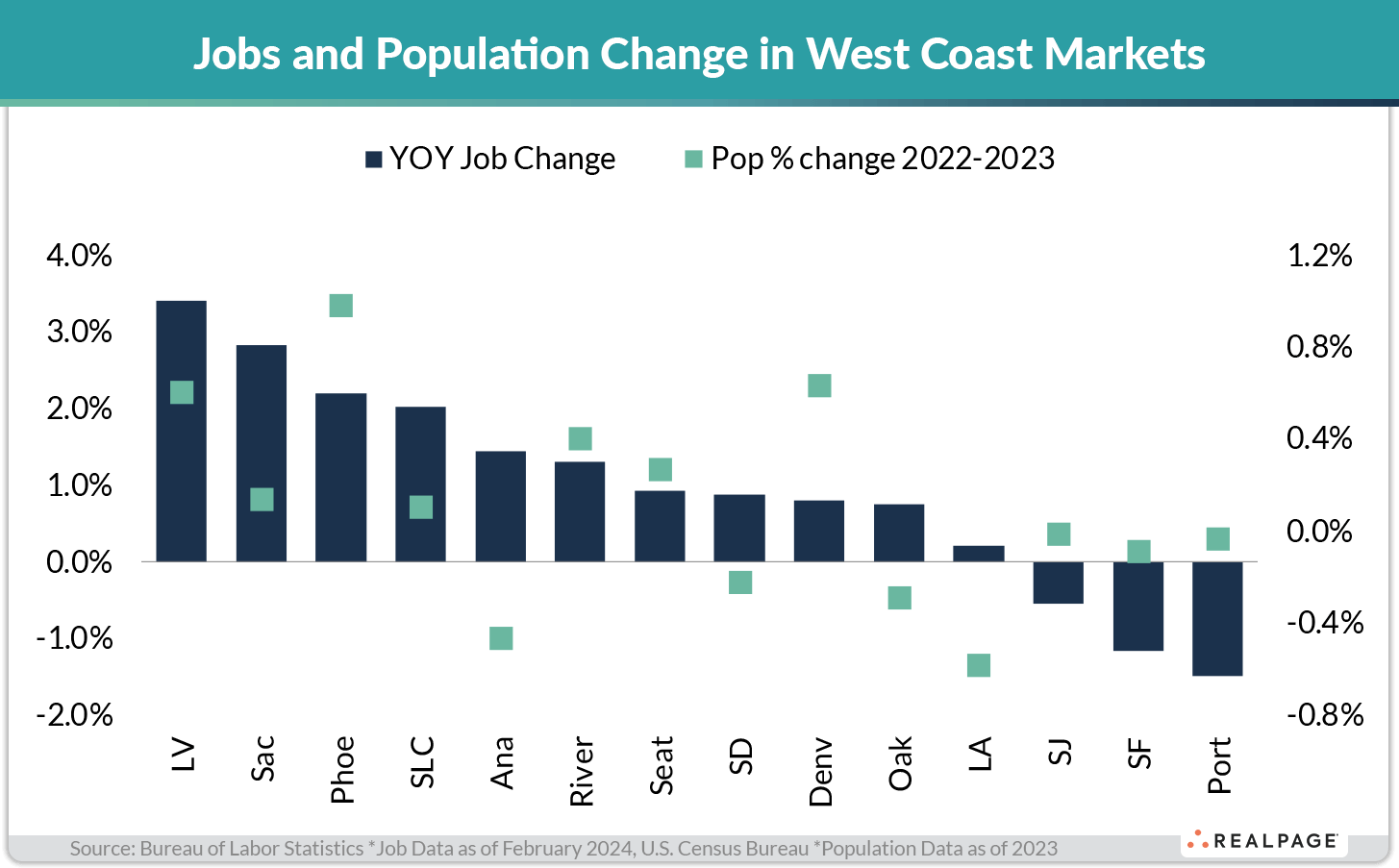 Jobs growth and population growth typically go hand-in-hand. As such, Los Angeles saw the region’s worst population decline between 2022 and 2023, with the market losing 0.6% of its resident base. Anaheim, Oakland and San Diego also logged notable loss between 0.2% and 0.5%.