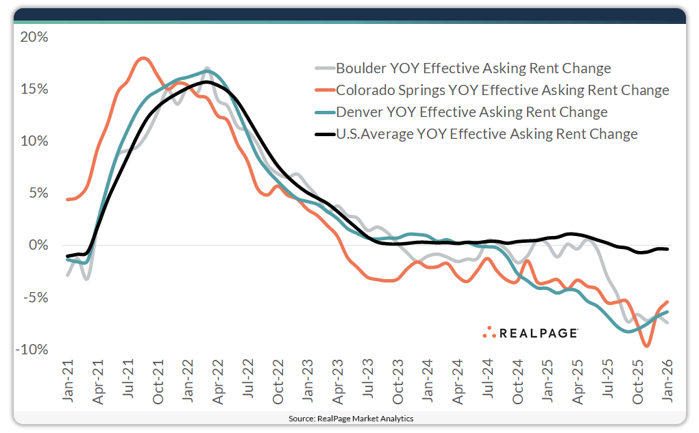 The three largest apartment markets in Colorado have been cutting rents at some of the most aggressive rates nationally amid elevated supply levels. During the year-ending January 2026, rent cuts in Boulder, Colorado Springs and Denver ranged from roughly 5.5% to 7.5%, landing the three markets in the bottom 10 for annual rent change among the nation’s 150 largest apartment markets, according to data from RealPage Market Analytics. In fact, rent cuts over the past six months have been the steepest each of those Colorado markets have witnessed in more than 15 years. Over the past two years, inventory growth was solid, averaging 7.1% in Colorado Springs and 4.4% in Denver. Those were well above the national average of 2.6% during that period. While the two-year average inventory growth in Boulder (2.7%) was in line with the U.S. norm, it was above the market’s long-term average growth rate of just over 1% annually. Similar to annual rent change, occupancy in all three markets has been running below the U.S. average. Occupancy in Denver and Colorado Springs has been consistently below the national norm for more than four years. However, Boulder was generally running in line with or above the U.S. rate for much of the past four years until dropping below the national average in the second half of 2025. As of January 2026, occupancy registered at 92.9% in Denver, 93.2% in Colorado Springs and 94.1% in Boulder. With new supply expected to slow in the coming year, occupancy and annual rent change are expected to get a lift, though rent cuts may persist.