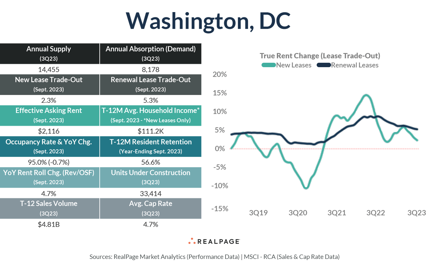 Washington, DC is the East Coast’s best apartment performer. Apartment demand was solid in DC at nearly 8,200 units in the year-ending 3rd quarter. While that was a bit behind the five-year average for the nation’s capital, absorption here was among the top showings in the U.S. in the past year. As a result, Washington, DC occupancy is holding relatively stable, ahead of the U.S. norm and right around the market’s decade average. While new lease trade-out isn’t sizable in DC, a rate of 2.3% as of 3rd quarter still outperformed the national average, a place the market has held onto steadily for six consecutive months. That was the first time in a decade that new lease trade-out in Washington, DC outperformed the U.S. for such a long period. Rent growth has generally been strongest in suburban submarkets that have witnessed minimal supply in recent years. In contrast, high-supply urban areas tend to lag the market average.