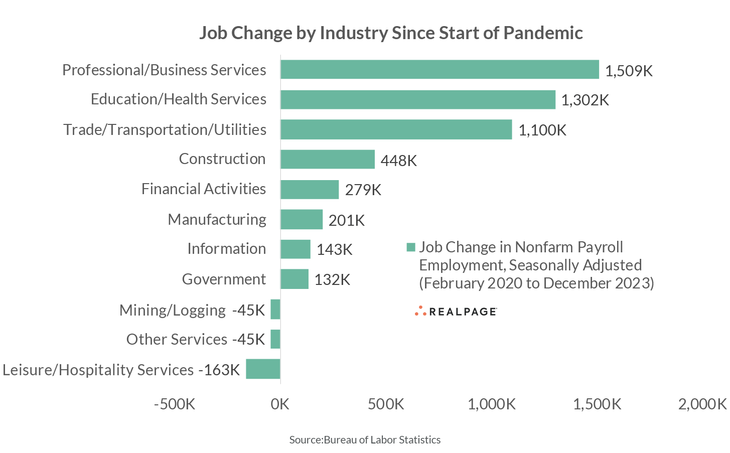 Most major industries have recovered all the jobs lost during the COVID-19 pandemic downturn. Professional and Business Services has seen the best recovery, with the recent job count coming in roughly 1.5 million positions ahead of February 2020 numbers. Also well ahead of pre-pandemic norms were Education and Health Services (+1.3 million jobs) and Trade, Transportation and Utilities (+1.1 million jobs).