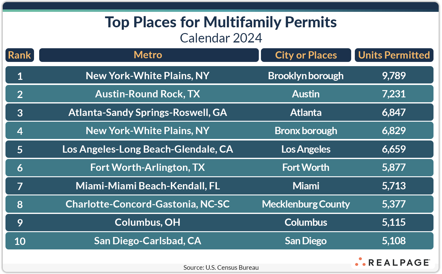 Additionally, only six markets permitted 10,000 or more multifamily units in 2024 compared to 13 markets in 2023.