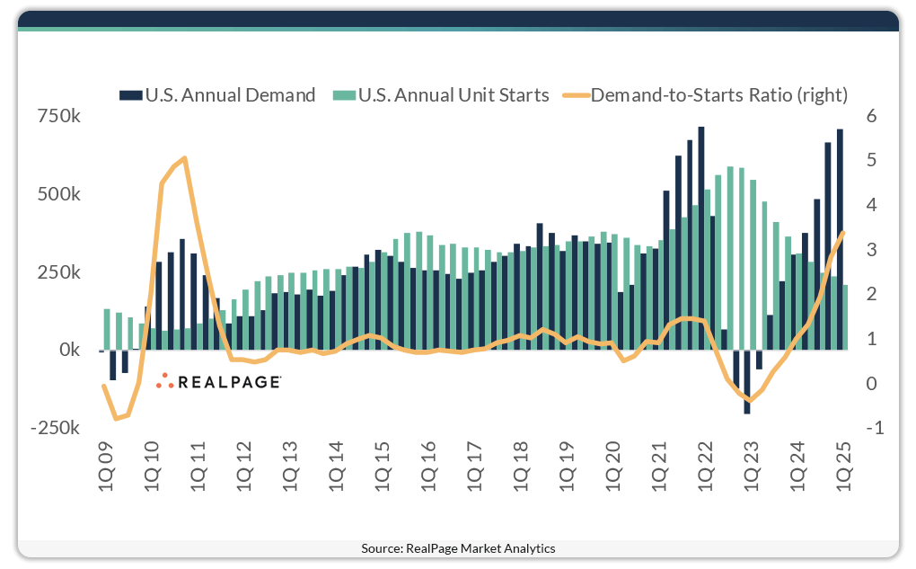 The U.S. apartment market is absorbing over three times more units than developers are getting off the ground right now. Just over 209,000 new market-rate apartment units started construction across the U.S. in the year-ending 1st quarter 2025. That was well below the annual average (307,300 units) from the past decade. In fact, annual starts volumes have fallen off every quarter for 10 quarters after peaking at roughly 587,000 units started in the year-ending 3rd quarter 2022. Meanwhile, the U.S. market is absorbing apartments much faster than new projects can be started. Demand reached a record high of nearly 708,00 units in the year-ending 1st quarter. That means that there were 3.4 times more units rented than started in the last year, which marks the highest demand-to-starts ratio since 2010.