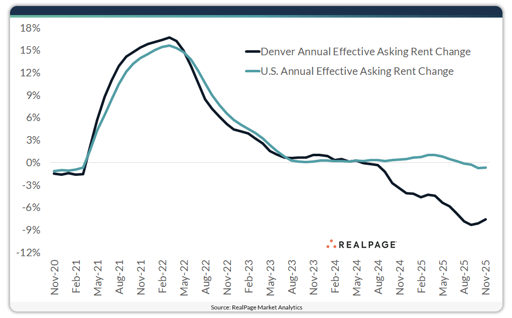 Denver apartment operators eased up slightly on rent cuts in November, but price declines in Mile High City remain some of the deepest nationwide. Price declines pushed effective asking monthly rates in Denver behind the national level earlier this year for the first time in a decade, and rental rates have continued to come down since. Effective asking rental rates were cut 7.6% across Denver in the year-ending November 2025, according to data from RealPage Market Analytics. Among the nation’s largest 50 apartment markets, this was one of the most significant declines, besting only Austin, where rents were cut 7.9% annually. Recent annual rent declines in Denver have eased from the record cuts reaching 8.3% in the year-ending September 2025. November marked a second consecutive month of easing declines. Rent cuts appear to be inspired by falling occupancy, as Denver occupancy hit below 93% in November, the first time under that mark in at least 15 years.