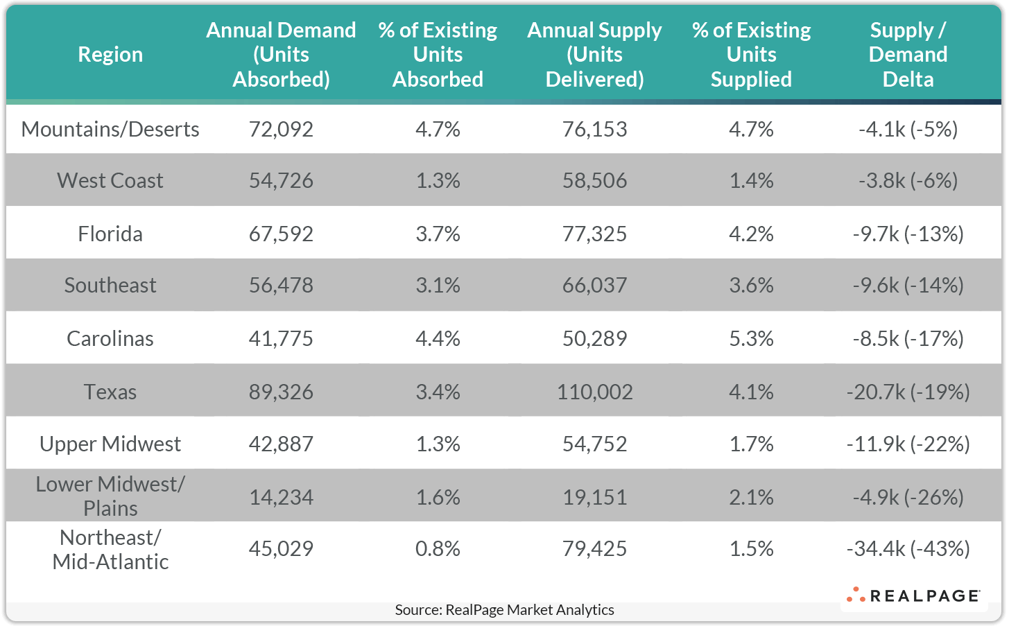 The Desert/Mountains region – which includes major apartment markets like Phoenix, Denver, Las Vegas and Salt Lake City – has seen notable improvement compared to last year. The demand shock of 2022 occurring just before the supply wave of 2023 and 2024 dampened apartment market performances across the region. More recently, the Desert/Mountains region has seen momentum shift faster than some other supply-heavy areas. This region absorbed more than 72,000 units in the past year, which was one of the best showings nationwide, behind only Texas. That volume translated to 4.7% of all existing stock, the most among the major U.S. regions. Annual demand in the Desert/Mountains region was behind the 76,100 or so units delivered concurrently, but not terribly. In fact, the 5% delta between those two figures was the smallest nationwide. In comparison, demand in Texas was 19% behind supply volumes. Looking at the region with the most similar delivery tally in the past year, Florida demand was 13% behind supply volumes.