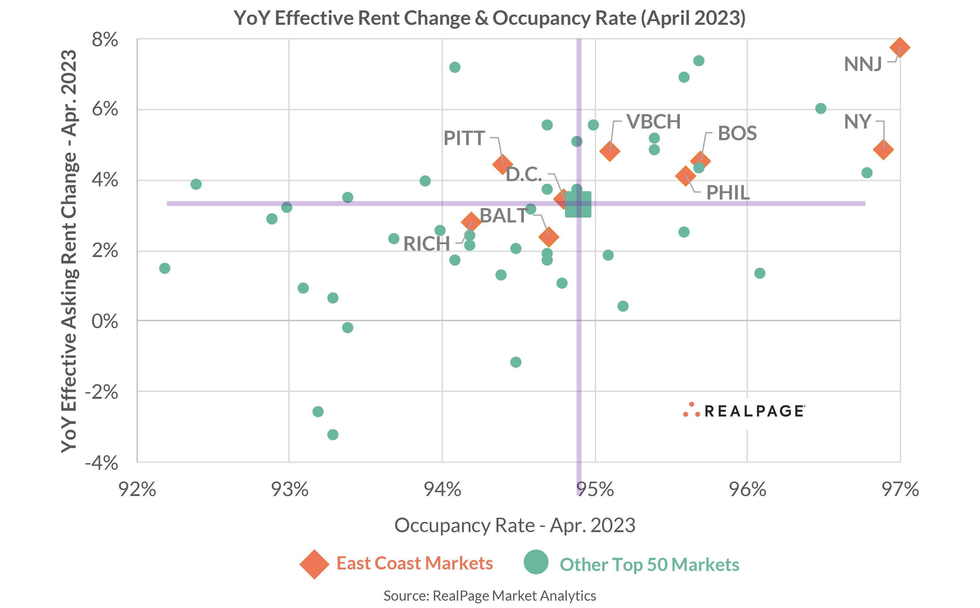 East Coast apartment markets tend to perform better than much of the U.S. when looking at occupancy rates and effective asking rent growth. As of April 2023, occupancy showings outperformed in all East Coast markets except for three – Baltimore, Richmond and Pittsburgh. For rent growth, all but two – Baltimore and Richmond – outpaced the U.S. norm. Northern New Jersey is the big winner among the East Coast markets, with occupancy of 97% and rent growth of 7.8%. both coming in well ahead of national averages. New York outperforms for both as well, but the occupancy performance stands out in a more pronounced way at 96.9%. While these larger, more expensive apartment markets along the East Coast saw deep decline during the worst setbacks of the pandemic, it’s clear that the remote-friendly working environment didn’t damage their stability. On the other hand, some of the West Coast markets have seen some difficulty triggered by economic headwinds from the tech sector.