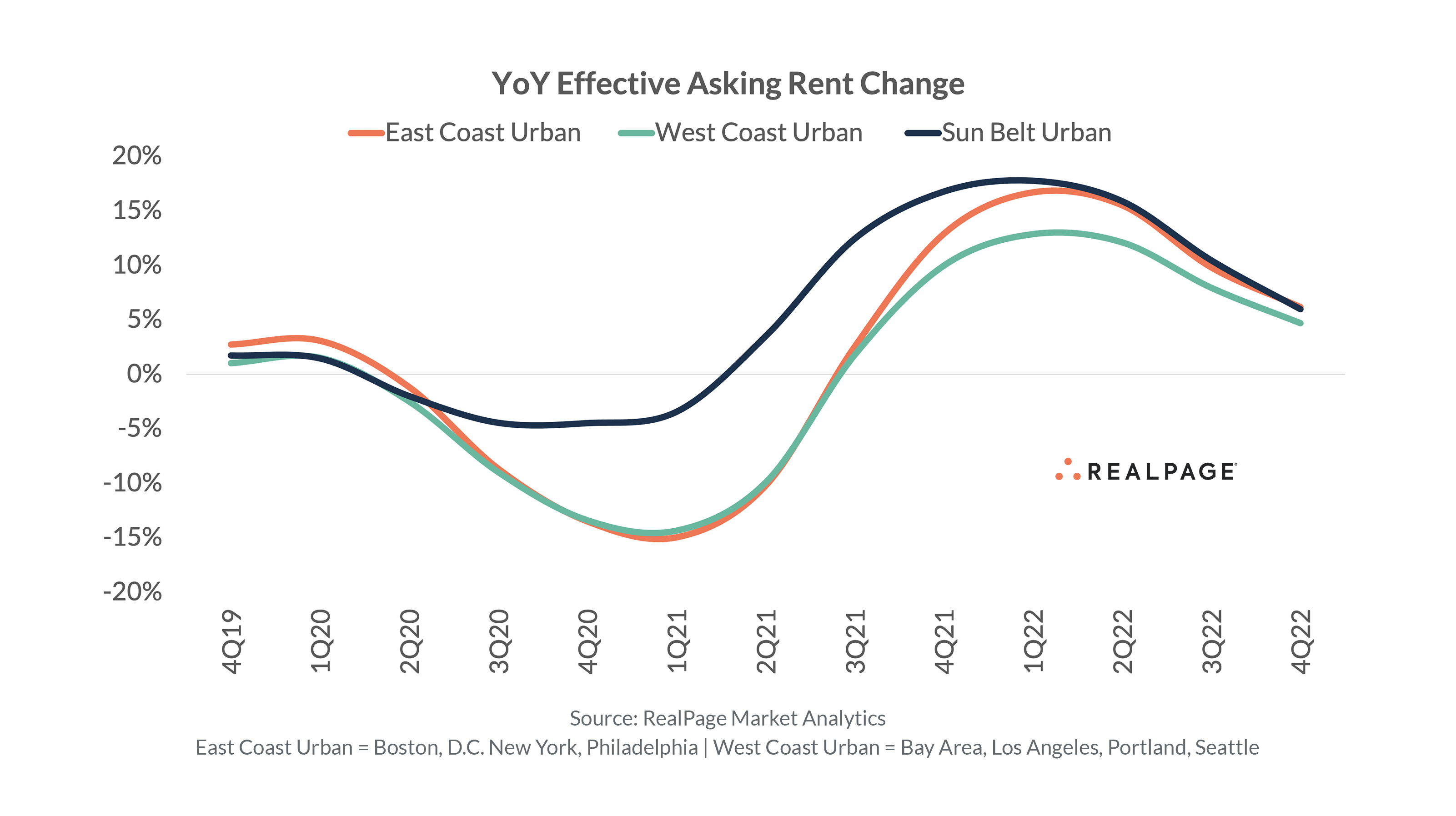 Remarkably so, demand in the Sun Belt metros has been more than robust enough to offset supply pressure. For instance, take a look at our East Coast/West Coast graphic from earlier with the Sun Belt urban cores overlaid on top.