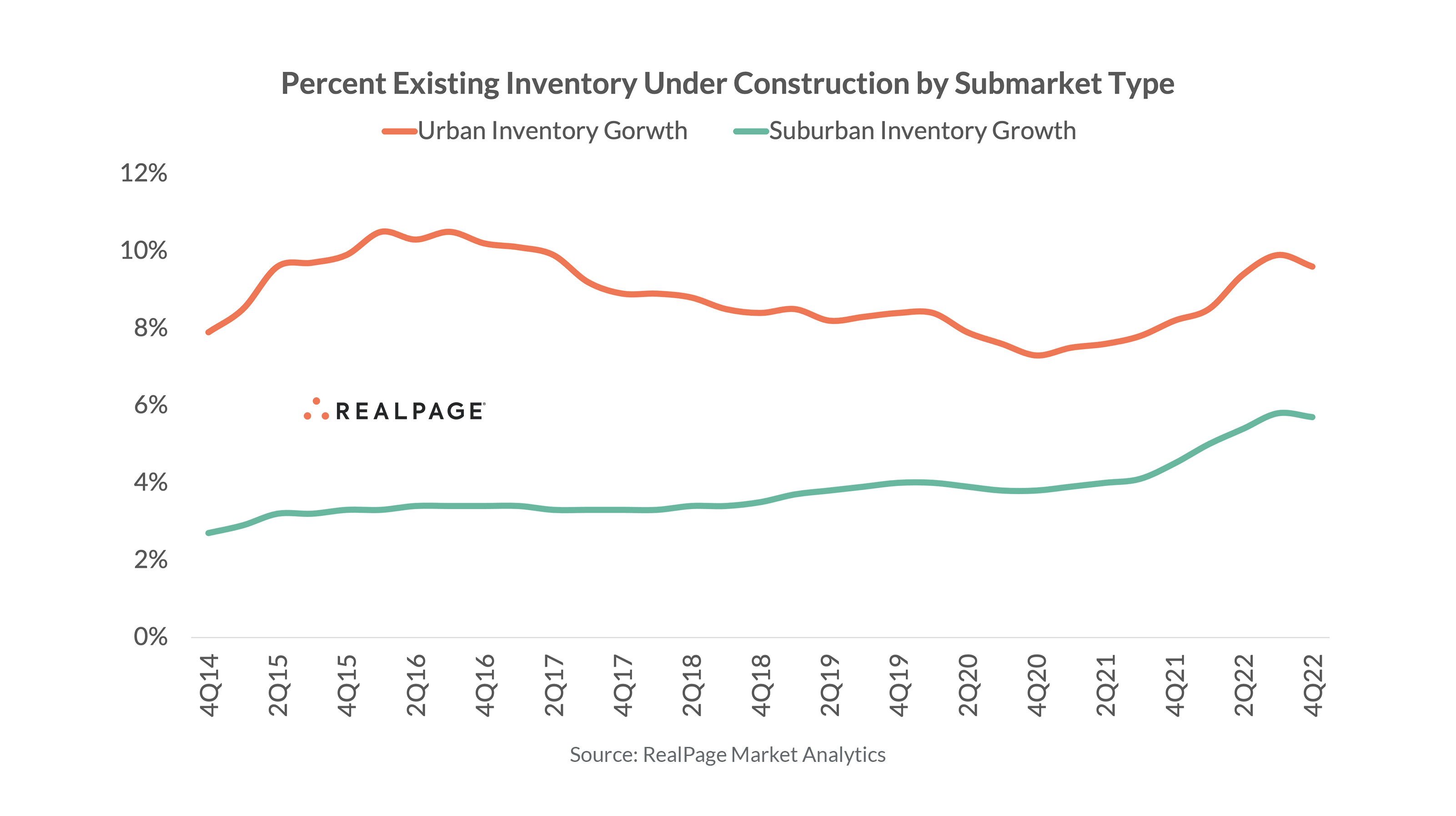 But there is perhaps a bit of truth to heavier concentration of units underway in urban cores. The 182,000 units underway at the end of 2022 accounts for nearly 10% of all existing stock. The suburban figure comes in at 5.7% - although do note that this is easily the largest inventory growth figure underway in at least four decades.