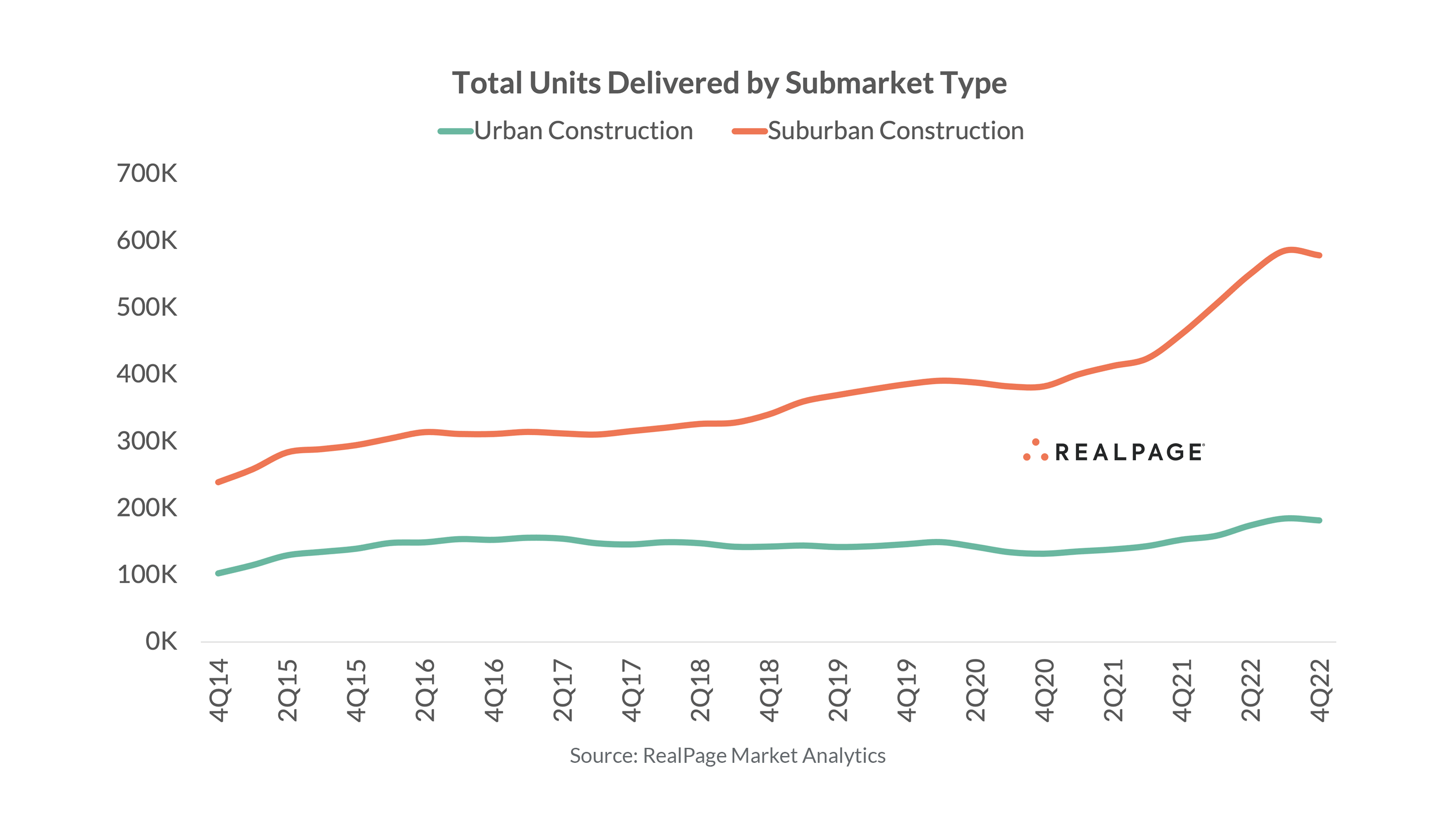 With only 11% of the nation’s existing stock belonging to urban cores, it’s practically impossible for most construction to fall within the urban core tranche of submarkets. Indeed, the bulk of ongoing construction belongs to suburban areas. At the end of 2022, some 578,000 suburban apartment units were under construction. By comparison, about 182,000 urban units are under construction.