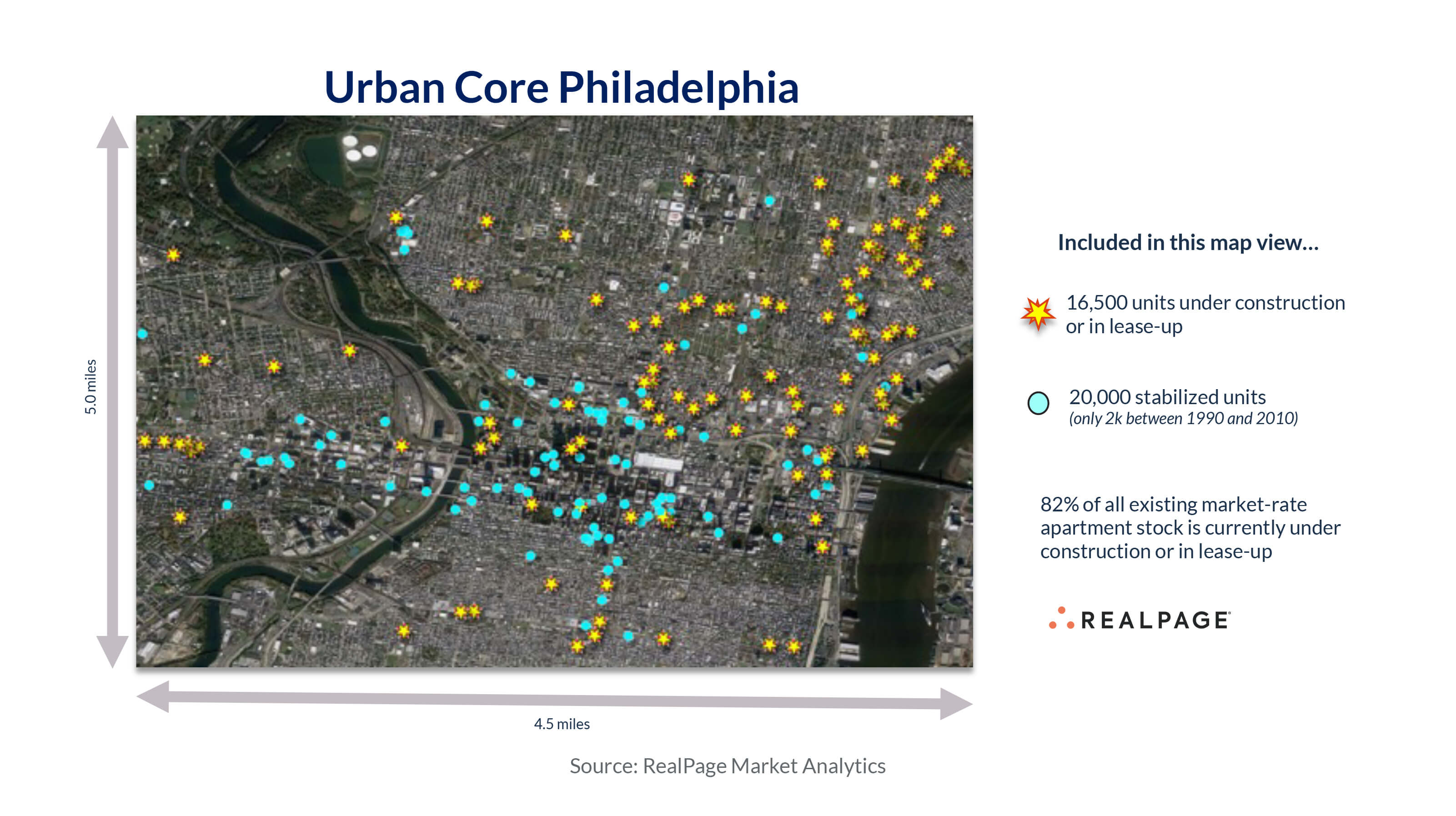 A great example of an urban core that’s undergoing a renaissance in terms of recent construction is downtown Philadelphia. Zooming in to an approximate five-mile by five-mile area really highlights how concentrated some urban cores are seeing new construction activity.