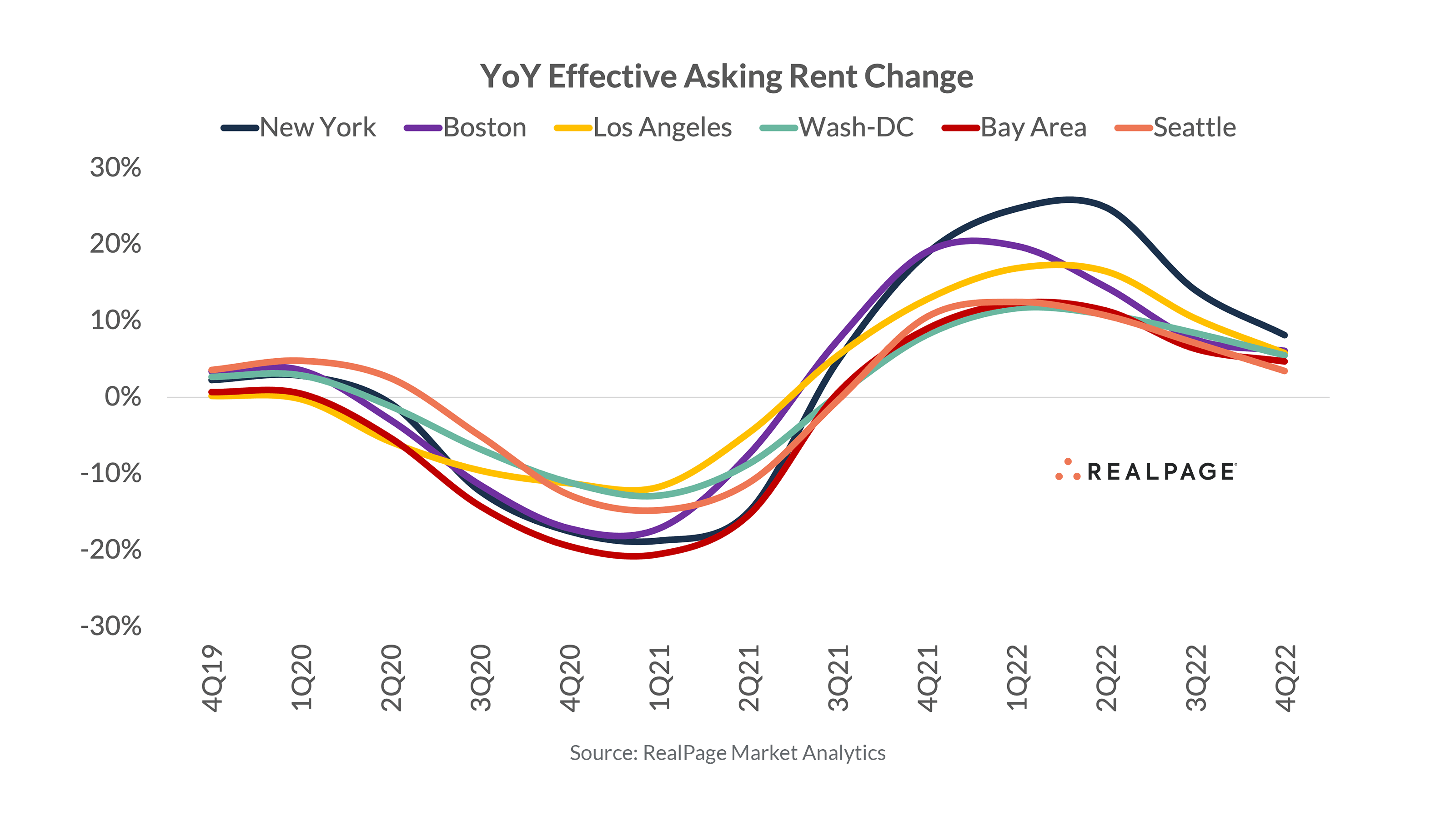 As of 4th quarter 2022, New York, Boston and Los Angeles have trended ahead of San Francisco and Seattle – two markets with a much higher skew towards technology jobs. And those two latter metros in particular are lagging the broader national trend to some degree.