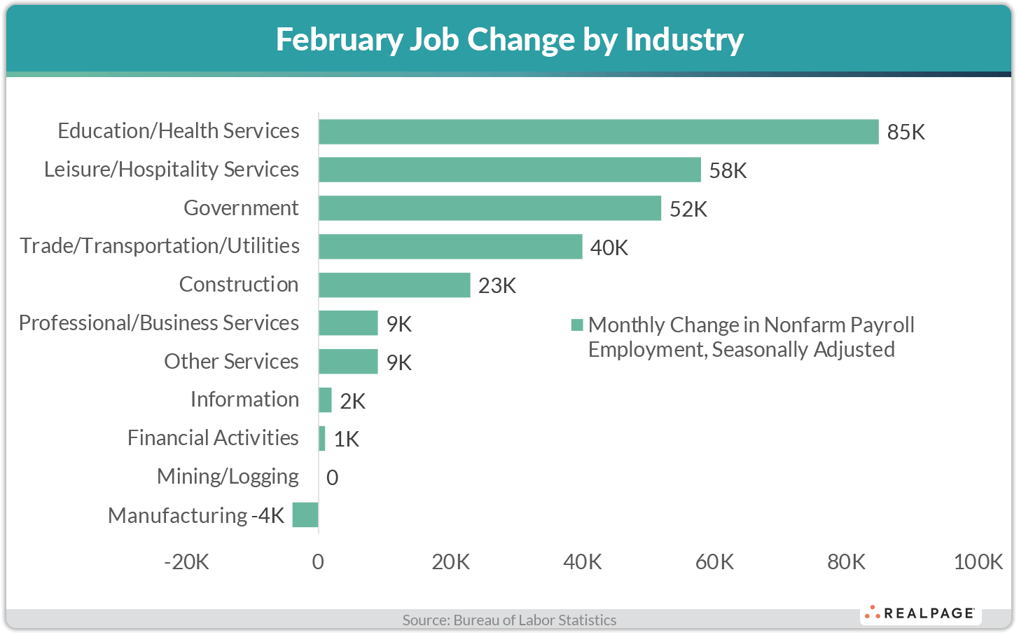 Job growth in February was seen in nine of 11 major industry sectors. The most notable job base expansion was in Education and Health Services (+85,000 jobs). Solid gains were also recorded in Leisure and Hospitality Services (+58,000 jobs), Government (+52,000 jobs), Trade, Transportation and Utilities (+40,000 jobs) and Construction (+23,000 jobs). Smaller job gains were seen in Financial Activities (+1,000 jobs), Information (+2,000 jobs), Other Services (+9,000 jobs) and Professional and Business Services (+9,000 jobs).