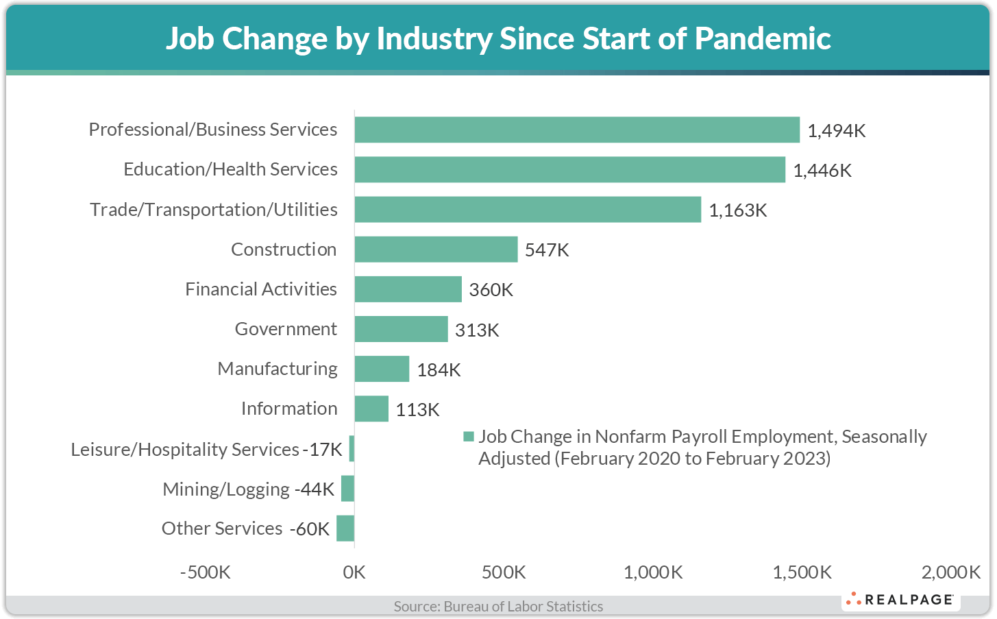 On an annual basis, the nation gained more than 2.7 million jobs in February 2023. Although that was the weakest annual gain since March 2021, it was above the pre-pandemic average of around 2.4 million jobs added annually from 2015 to 2019.