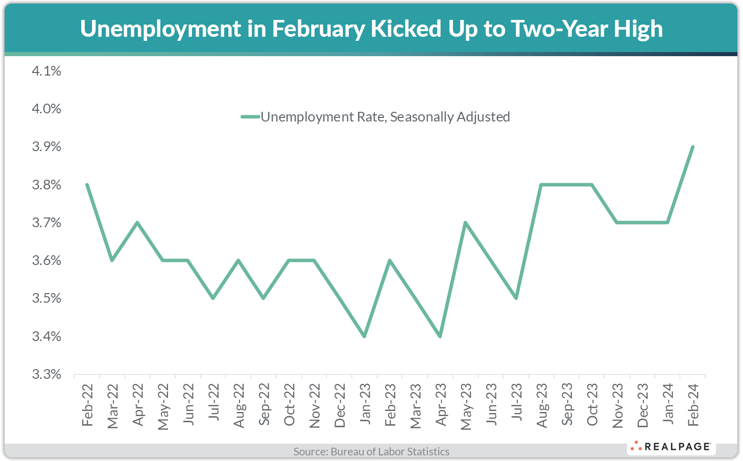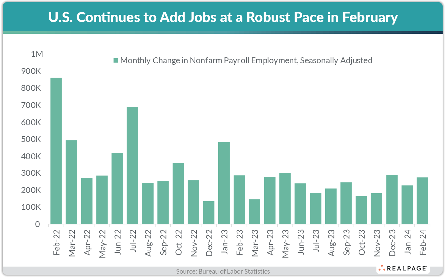 Of note: The job counts for December and January were revised considerably lower. Downward revisions to December 2023 data showed 43,000 fewer jobs were added than previously reported, down from 333,000 to 290,000 positions. The January 2024 job growth number was also revised down, decreasing by 124,000 jobs to a total of 229,000 positions. With these revisions, employment gains in December and January combined were 167,000 jobs lower than previously reported.