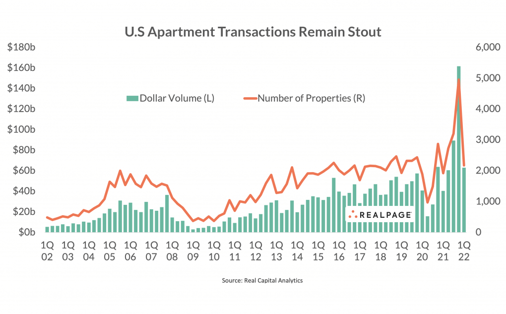 Roughly 2,200 apartment properties changed hands at a value of nearly $63 billion during 1st quarter 2022, according to Real Capital Analytics (RCA). This was the strongest 1st quarter on record, though transactions were well below the previous quarter when around 4,900 properties changed hands for more than $161.6 billion.