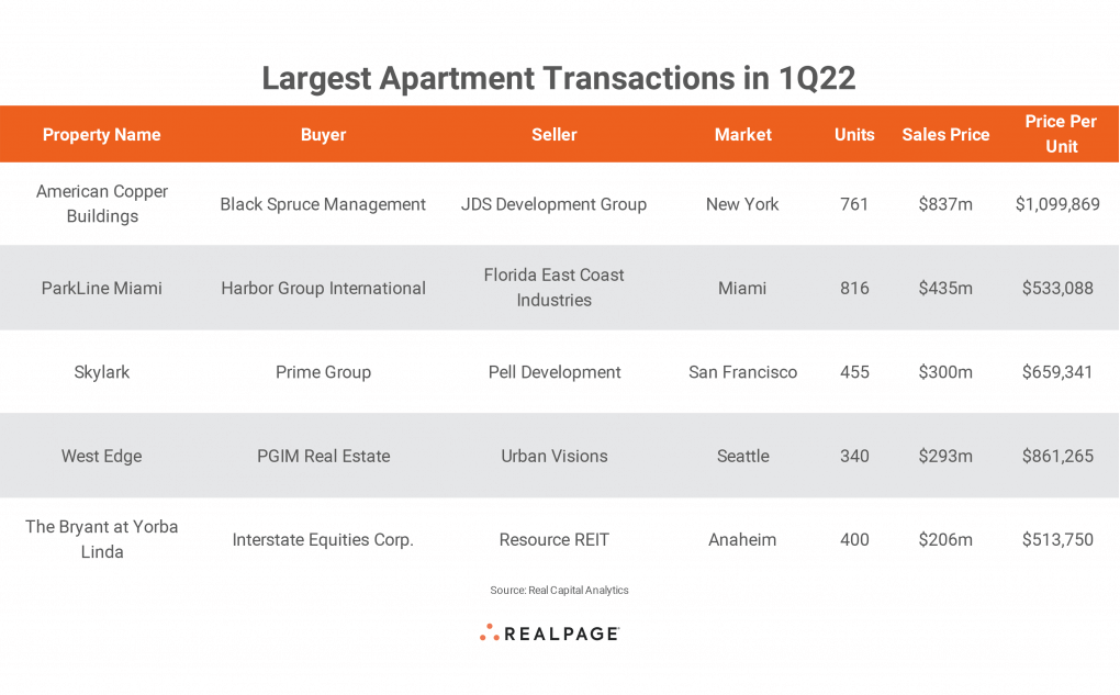 Here are the five largest individual apartment transactions from January through March, with all these transactions occurring on the East or West Coast.