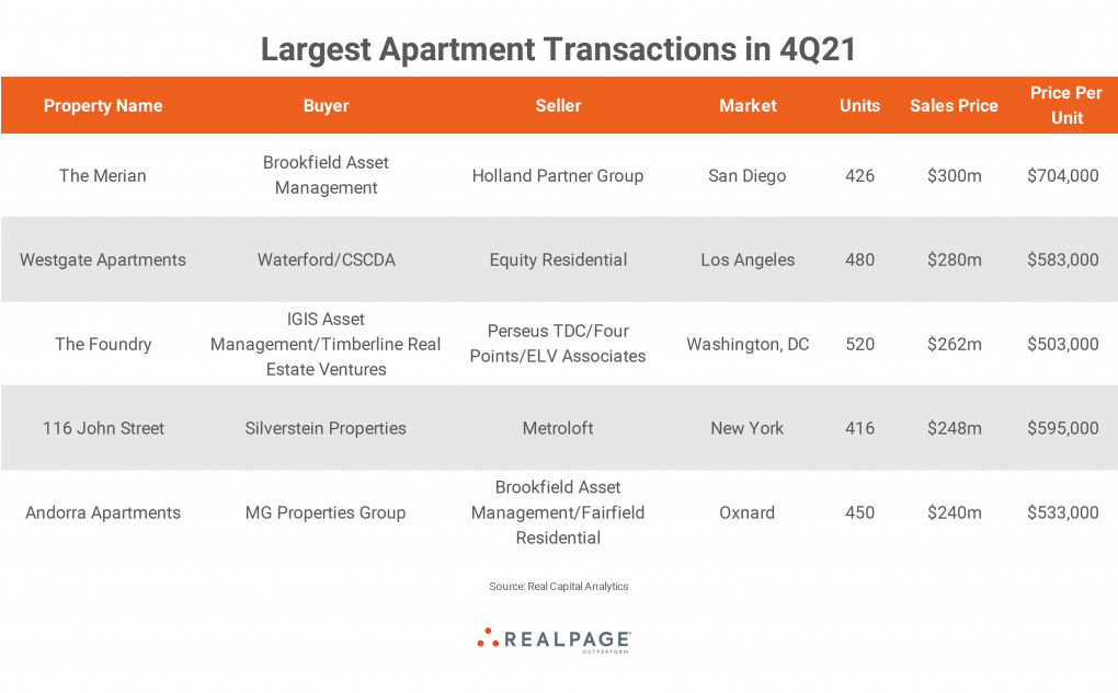 Here are the five largest individual apartment transactions from October through December.