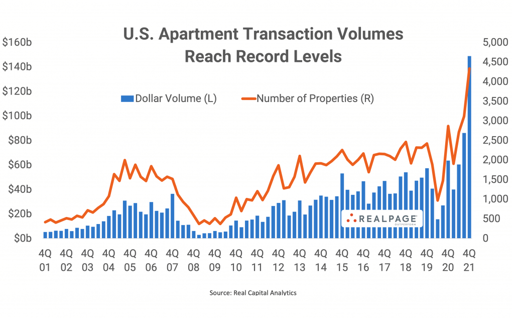 Roughly 4,300 apartment properties changed hands at a value of nearly $148.9 billion during 4th quarter 2021, according to Real Capital Analytics (RCA). That dollar volume was the highest on record in at least 20 years and was 73% higher than the previous peak which was recorded in 3rd quarter 2021. The number of properties changing hands was also at a record high, after hitting a recent peak of over 3,100 units the previous quarter.
