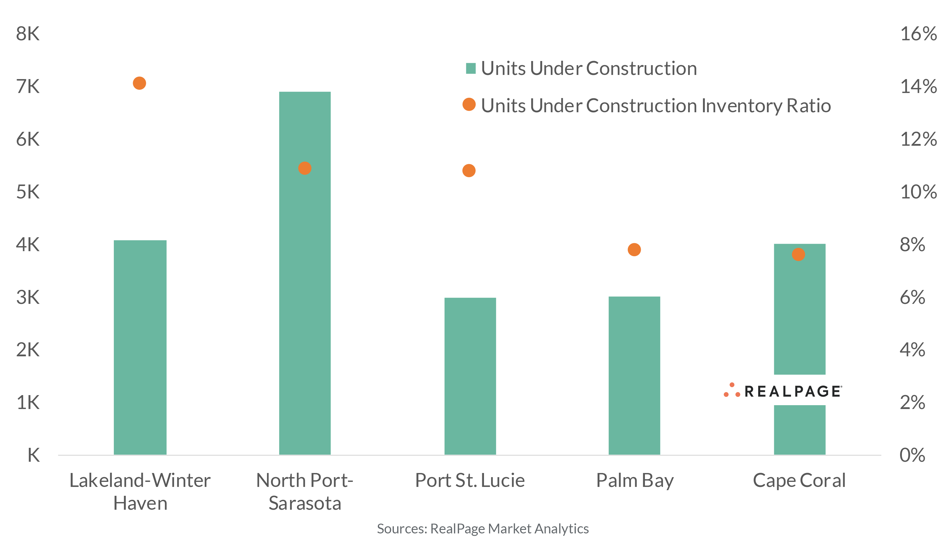 Several small Florida markets have some serious apartment supply underway, and most of them are located along the shoreline. Lakeland-Winter Haven – the only non-beach town on this list – will grow its apartment inventory by the most prolific ratio in the state of Florida in the near term. The more than 4,000 apartment units under construction will grow that small market 14.1%, according to analysis from RealPage Market Analytics. In North Port, apartment supply has been elevated for several years, despite dipping marginally in 2022. The nearly 6,900 units underway there will swell that market by 10.9%. Meanwhile, nearly 3,000 units underway in Port St. Lucie will grow that market by 10.8%. The more than 3,000 units and 4,000 units underway in Palm Bay and Cape Coral, respectively, will grow apartment inventory in those markets by just under 8%.