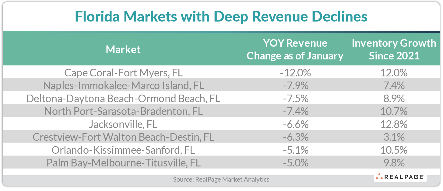 Florida markets with the worst revenue declines in the past year were inevitably some of those small beach towns that saw demand increase in 2021 and 2022 and are now feeling the aftershocks of increased inventory growth.