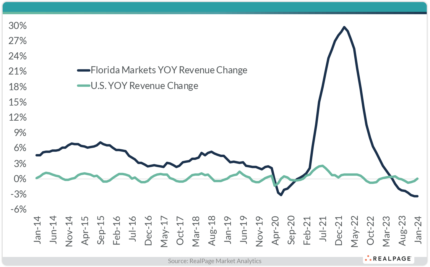 Revenue change in Florida markets hit a recent low in January, a far cry from the extreme peaks of 2021 and 2022.