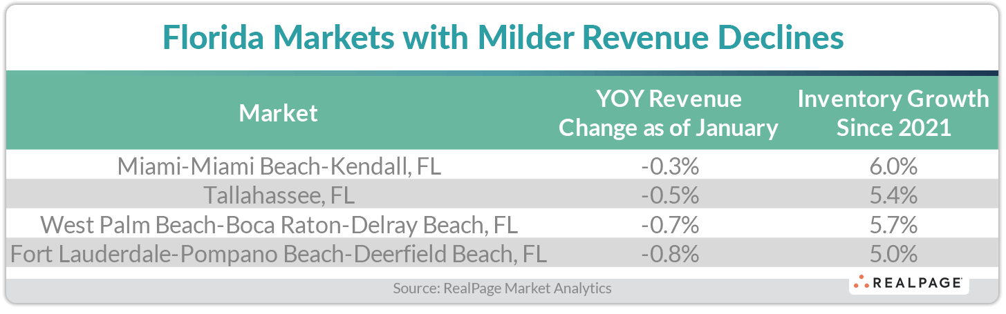 On the other hand, some larger Florida apartment markets logged less severe revenue declines in the past year. These markets are used to inventory growth and didn’t get hit as hard as some smaller markets.
