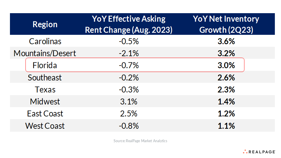Florida is one of the nation’s fastest growing apartment regions, and all that new supply is putting downward pressure on rent growth. Among the eight geographic regions defined by RealPage, Florida is the third-fastest growing area, with net inventory growth of 3% in the year-ending 2nd quarter 2023. That performance followed the Carolinas and the Mountains/Desert region, but not by much. While Florida has seen some of the nation’s strongest apartment demand in recent years, even solid absorption has not been enough to keep up with big volumes of new supply. And those intense completions volumes are putting downward pressure on rents. Just a year ago, annual effective asking rent growth in the Sunshine State reached into the double digits, but prices are now in decline, falling 0.7% year-over-year as of August.