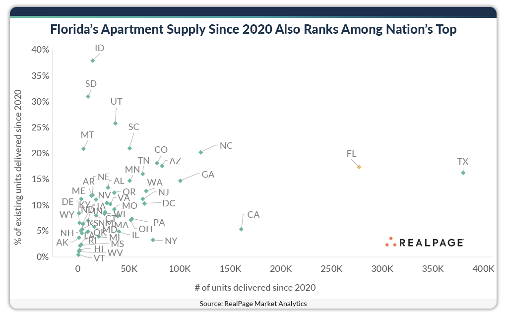 Roughly 285,000 new market-rate apartments have been delivered in Florida over the past four years, while Texas saw nearly 395,000 units complete, according to data from RealPage Market Analytics. In a distant third place was California, which added 170,000 units during that period. However, California's population (40 million) is nearly double that of Florida (23 million), which points to the significance of the local apartment supply volume.
