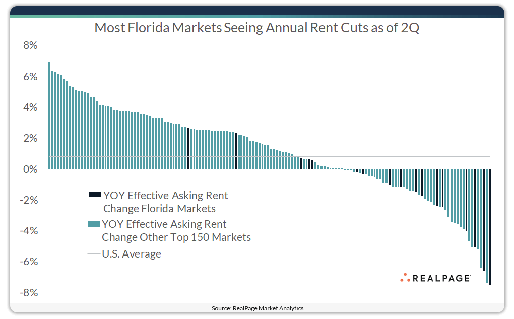 Most Florida apartment markets are logging deep rent cuts, prompted by the continued battering of apartment supply volumes in recent years.