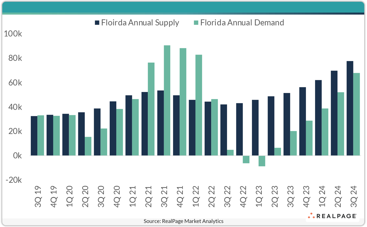 Across the state of Florida, apartment demand volumes are catching up to elevated supply.