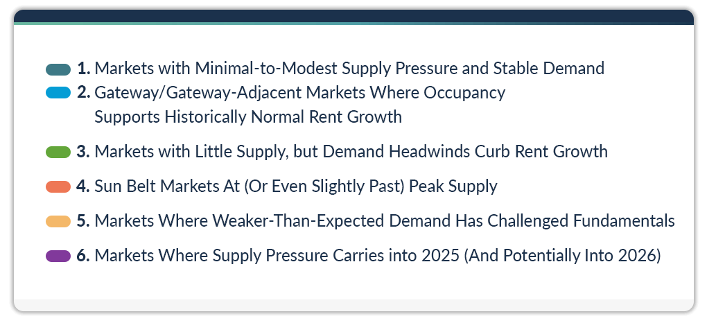 While apartment rent growth is expected to pick up in the coming year – while still trailing previous decade norms under the weight of new supply – market-level expectations vary based on many factors. Generally speaking, rent growth expectations in 2025 at a market-level can be split into a few categories.