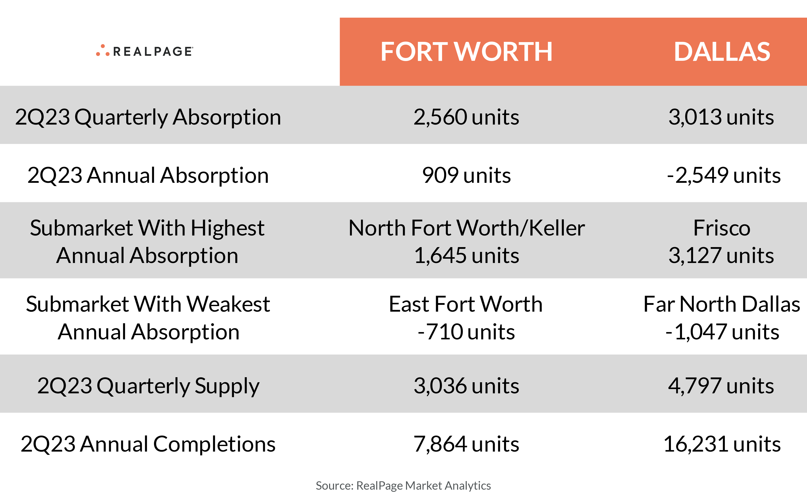 In a reversal of the typical pattern, apartment demand in Fort Worth accounted for nearly half of the Dallas/Fort Worth total in 2nd quarter 2023 – despite apartment inventory there being about one third that of Dallas.