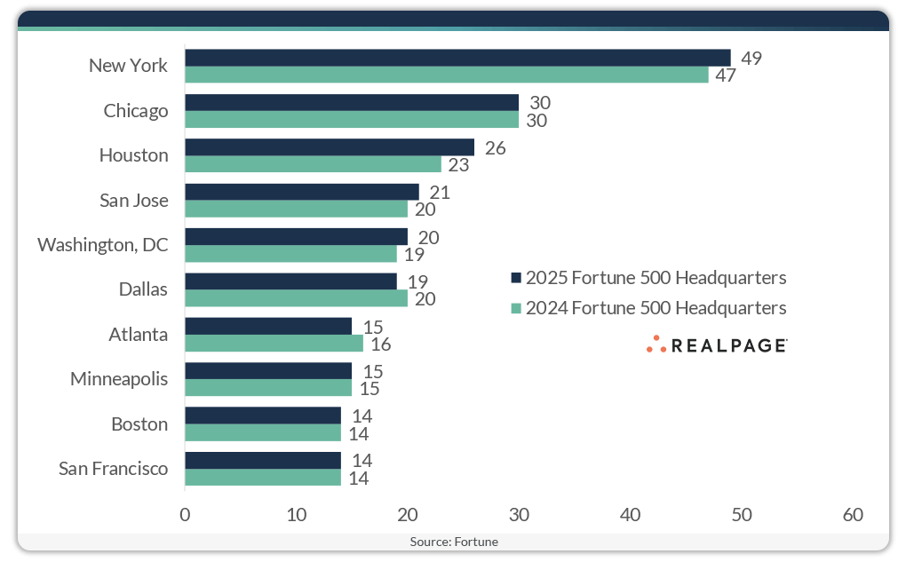 The nation’s 500 biggest revenue-generating businesses produced a total of $19.9 trillion in revenue during the 2024 fiscal year, an annual increase of nearly 6%, according to the recently released 2025 Fortune 500 rankings. That revenue figure represents roughly two-thirds of the nation’s gross domestic product. The companies that made it onto the Fortune 500 list this year are headquartered in 227 cities across 37 states and fall within 106 markets based on apartment markets defined by RealPage Market Analytics. New York continues to rank as the nation’s top market with the headquarters of 49 Fortune 500 companies in the 2025 rankings, up by two companies from 2024’s list. The #2 market in the nation is Chicago, home to 30 Fortune 500 companies, with that count unchanged year-over-year. At #3, Houston has 26 Fortune 500 headquarters, up by three companies over the past year. San Jose gained one company and overtook Dallas, taking the #4 spot with 21 Fortune 500 headquarters. Washington, DC also surpassed Dallas, gaining one company in the past year and ranking #5 with 20 Fortune 500 headquarters. Dallas has 19 Fortune 500 headquarters and dropped to the #6 spot after losing one company over the past year. Atlanta’s Fortune 500 headquarters count was also down by one in 2025 at 15 but remained in the #7 spot nationally. Minneapolis remained in the #8 slot, with its Fortune 500 headquarters count unchanged at 15. Boston and San Francisco remained tied at #9, both with 14 companies and both unchanged year-over-year.
