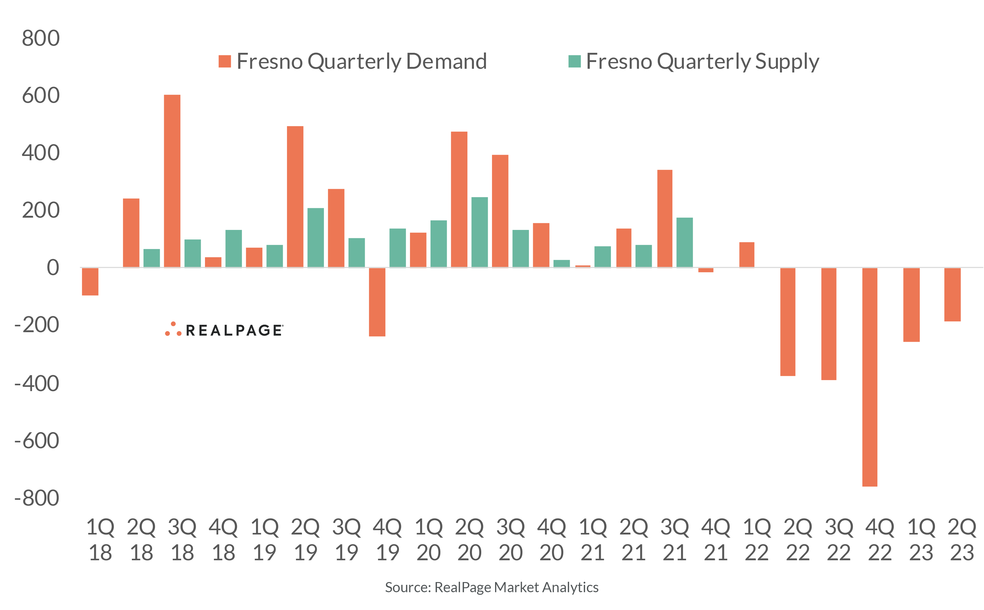 While U.S. apartment demand is below seasonal norms across the U.S., Fresno is suffering worse than most, logging a fifth consecutive quarter of net move-outs in the April-June timeframe. This small California market with about 56,600 units located just south of the Bay Area is one of the most affordable apartment markets in the state. And recently, apartment demand loss has held on here, continuing with net move-outs from another 186 units in 2nd quarter, taking the market’s annual loss to 1,581 units, according to data from RealPage Market Analytics. Meanwhile supply, which was already very mild, has disappeared altogether. No new apartments were delivered in Fresno in 2nd quarter, marking a sixth quarter void of deliveries. The pipeline here isn’t completely dried up, though. Looking forward, 420 units are under construction in Fresno, with all that supply scheduled to complete in the coming year. Net move-outs in Fresno have weighed on occupancy recently, but even with declining fundamentals, occupancy here remains tight at 96.7%.