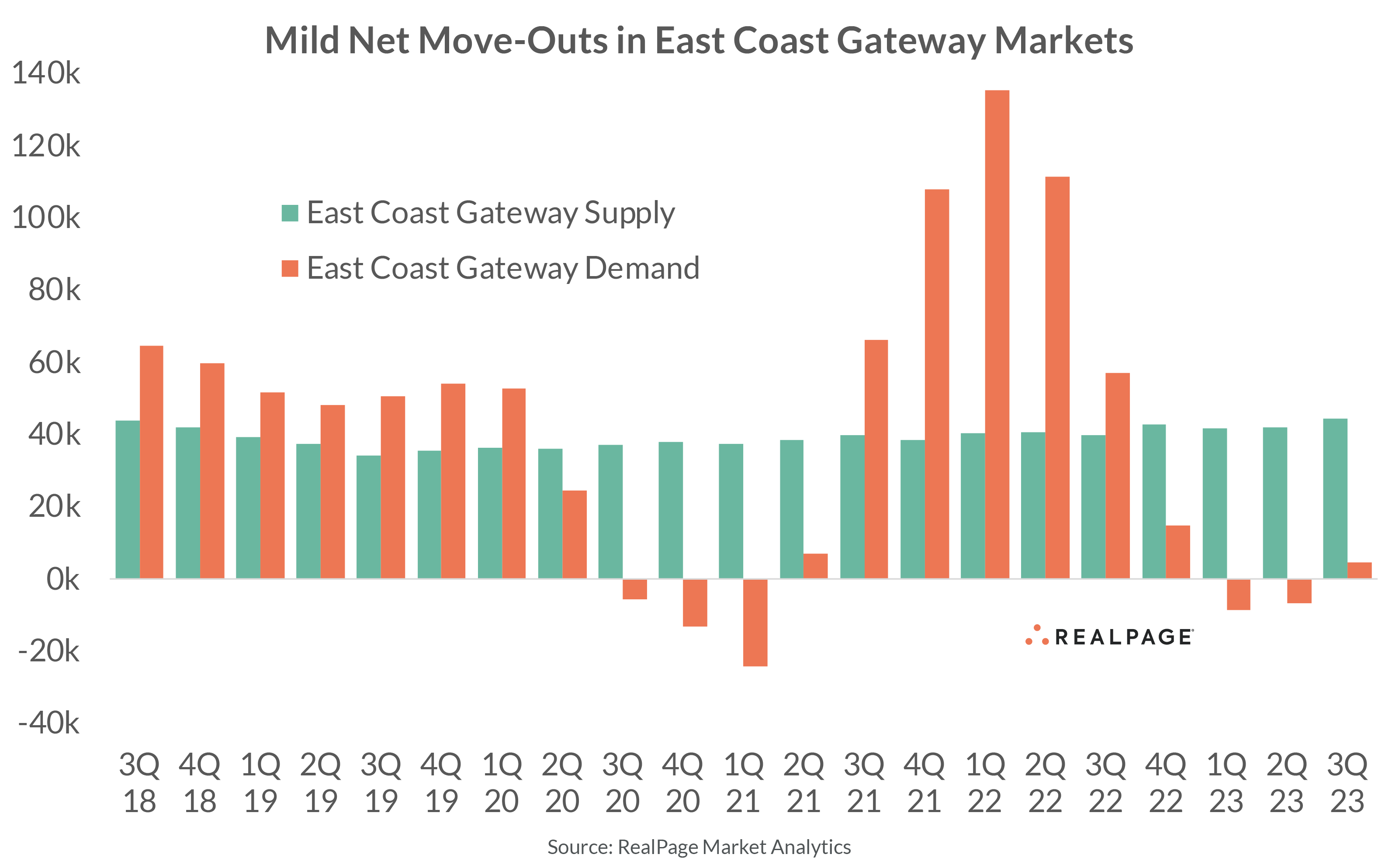 In East Coast gateway markets, net move-outs have been much milder. Roughly 9,000 units were lost at the bottom point in the year-ending 1st quarter 2023, which was not the worst showing these markets have seen in recent years. (That belongs to the nearly 25,000 net move-outs recorded in the year-ending 1st quarter 2021.) And in the year-ending 3rd quarter, positive demand returned at a mild 4,600 units or so. Meanwhile, supply has been significant. About 44,500 units were completed in the past year in the East Coast gateway markets, which was a recent peak.