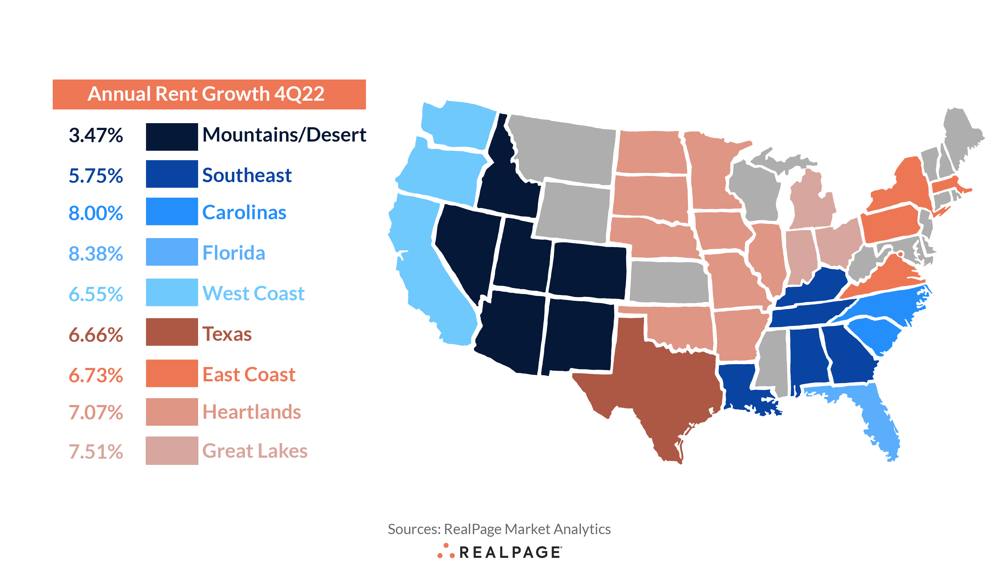 The Great Lakes region is home to some of the most consistent apartment markets in the country. Looking at 20 years of annual effective asking rent growth, prices in the Great Lakes remained subdued – compared to some regions – during the months of intense hikes in 2021. Additionally, price cuts never got too deep in this region during the lows of 2020. Alternatively, the Mountains/Desert region has proven to be the most volatile apartment region. In 2021, peak rent growth above 13% was achieved across several regions: the Mountains/Desert area, the Southeast, the Carolinas, Florida and Texas. On the other hand, while rent growth was strong in the West Coast, East Coast, the Heartlands and the Great Lakes, the 2021 price increases did not get as steep, hovering mostly between 9% and 10%. West Coast markets, which had a lot more ground to recover from 2020, saw rents go up a bit more at 12%. In 2022, price hikes came down across the board, but the decline was much less significant in the markets along both coasts and the two Midwest regions, while the less stable parts of the country saw rent growth drop notably from previous highs.