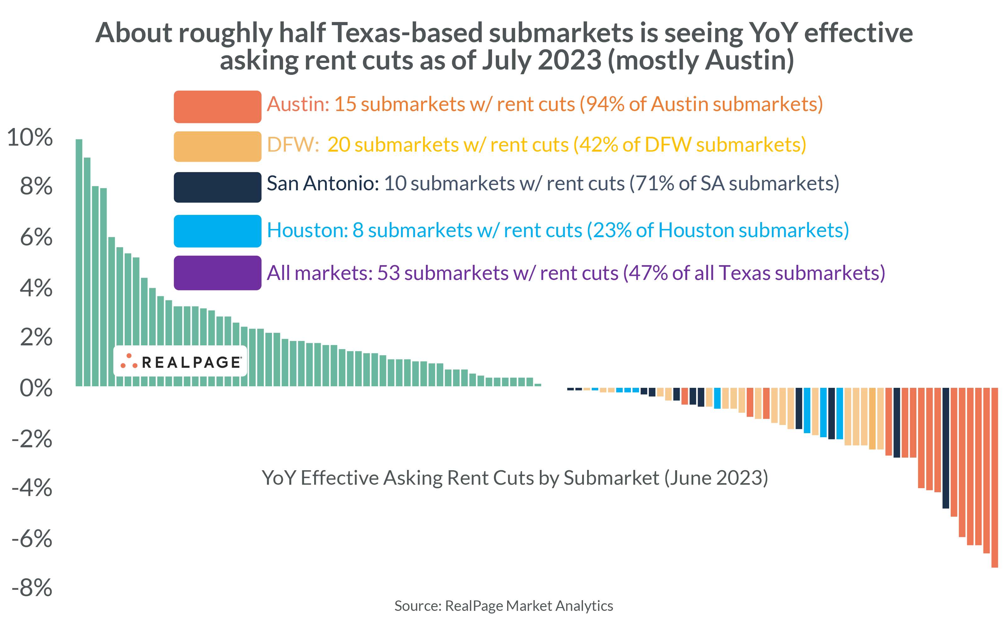 Out of the 113 submarkets across the largest Texas markets of Austin, Dallas, Fort Worth, San Antonio and Houston, 53 submarkets cut rent in the year-ending July. This trend has gotten worse throughout the past few months and took a significant leap in July. Just 24 of those 113 Texas submarkets were logging rent cuts in the year-ending June.