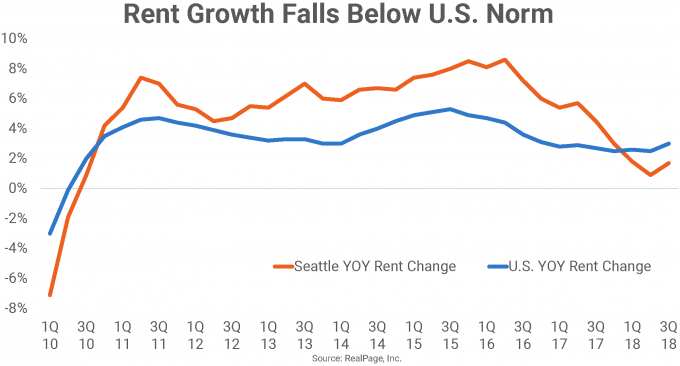 While the nation overall saw price increases move in a gentle downward trend throughout much of the past few years, Seattle endured a sharper decline. After peaking at 8.6% in 2nd quarter 2016, year-over-year rent growth in Seattle has fallen nearly every quarter. Despite the slight uptick seen in the past three months, specifically, year-over-year rent growth is at just 1.7% in 3rd quarter 2018, registering at a little more than half the national average of 3%.