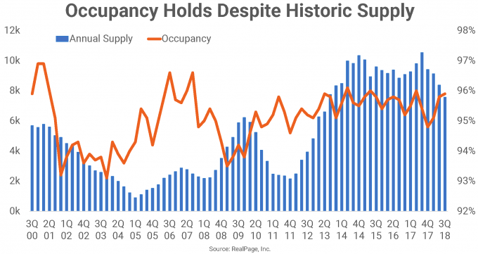 Not surprisingly, Class C units recorded the tightest occupancy rates in fall 2018, with a reading of 96.5%. Class B stock was essentially in line with the market norm at 95.8%, while Class A units were a bit softer – but still not bad – at 95.3%.