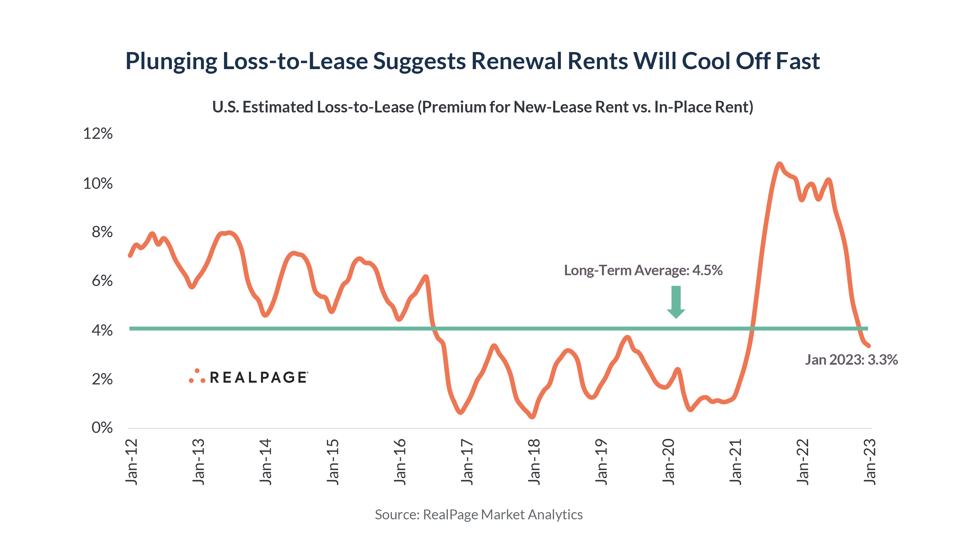 New lease rent cuts coupled with continued renewal rent growth leads to loss-to-lease compression. As a result, loss-to-lease has plunged down just as fast as it soared upward in 2021. Loss-to-lease as of January measured 3.3%, below the long-term norm of 4.5%.