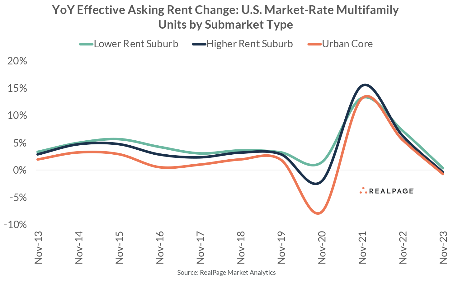Rent growth in low rent suburbs has outperformed higher rent suburbs (and urban core) counterparts over the past 12 months – albeit to a modest degree. The increased volume of supply in areas with lower rental rates could be one of the driving forces behind the slowdown in Class B rent growth over the past 12 months. Class B units tend to be more concentrated in lower rent submarkets. Indeed, lower rent suburbs are seeing Class A rents grow by 1.0% as of November 2023, versus 0.3% for the submarket grouping on aggregate.