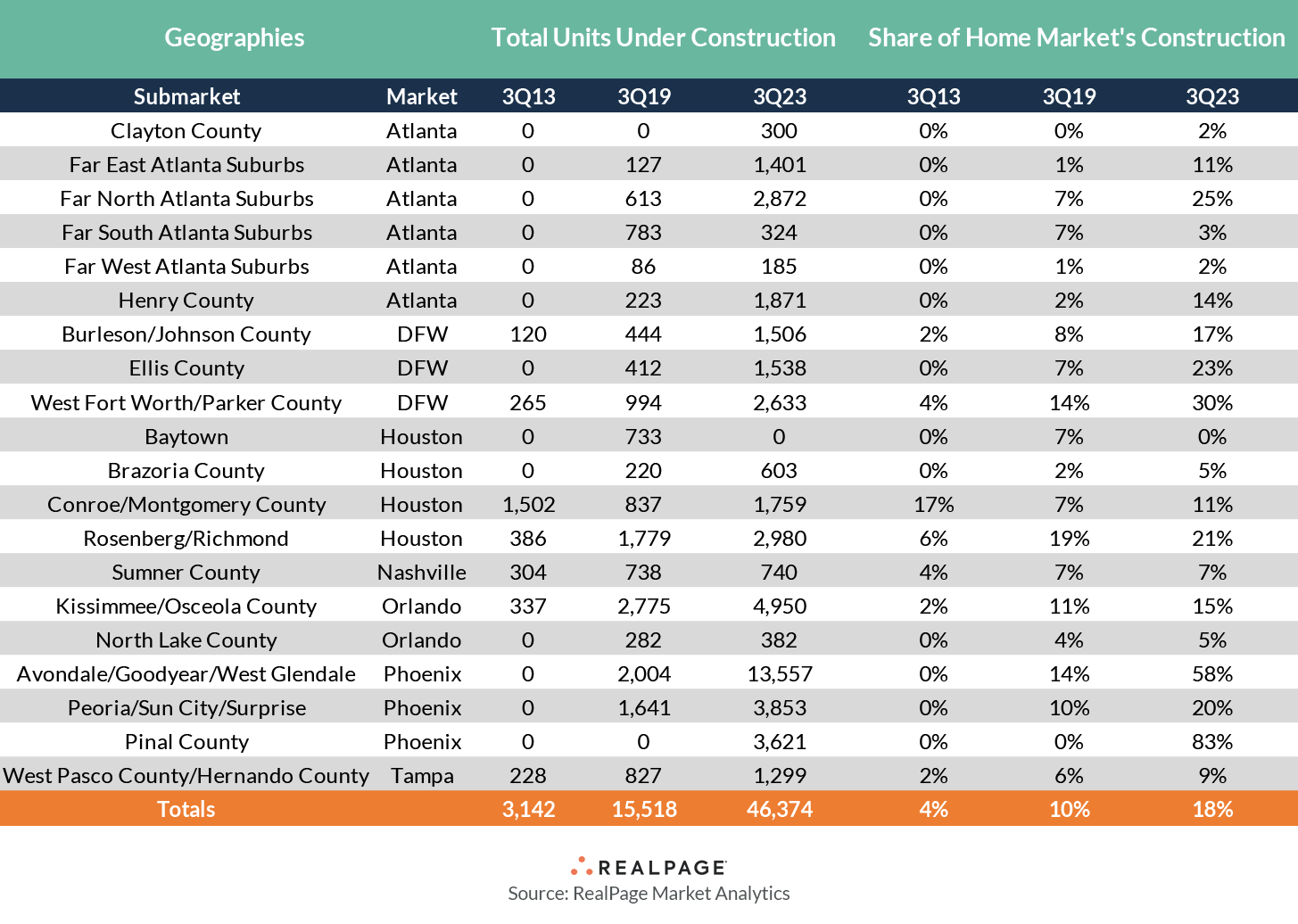 The following collection of submarkets highlights several markets known for urban sprawl. Far outer lying submarkets (arguably even “exurban” 10 years ago) in these markets informed just 4% of their markets’ share of development in 2013. That jumped to 10% as of 2019 but has since shot up to nearly 20% as of 2023.