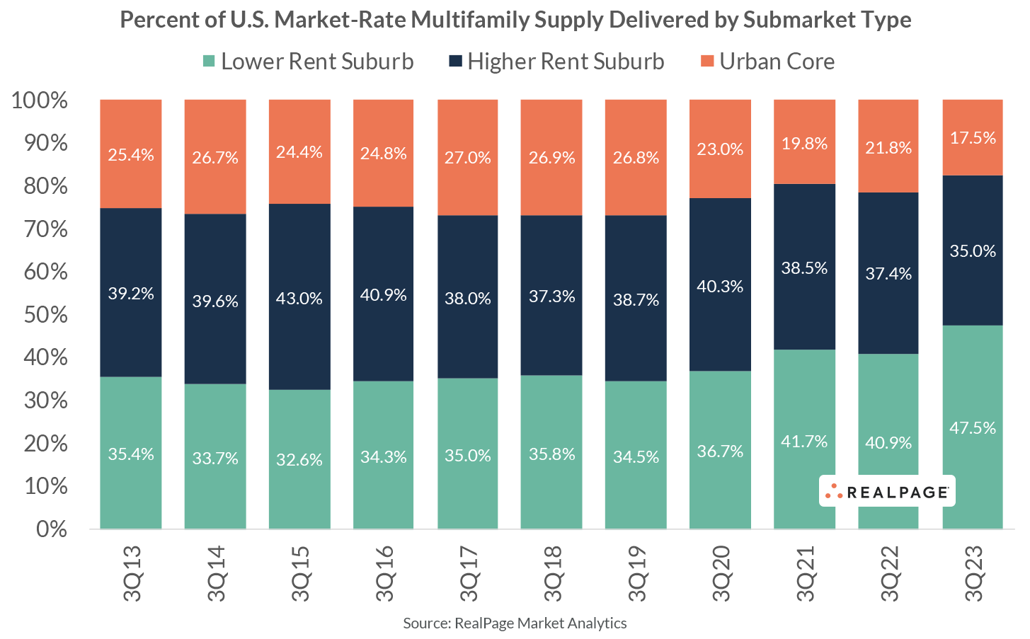 Though higher rent suburbs comprise just a third of the nation’s market-rate multifamily housing stock, those same suburbs were consistently delivering about 40% of all suburban construction over the past decade. Urban cores meanwhile make up about a quarter of all supply delivering (despite accounting for just 15% or so of existing stock).