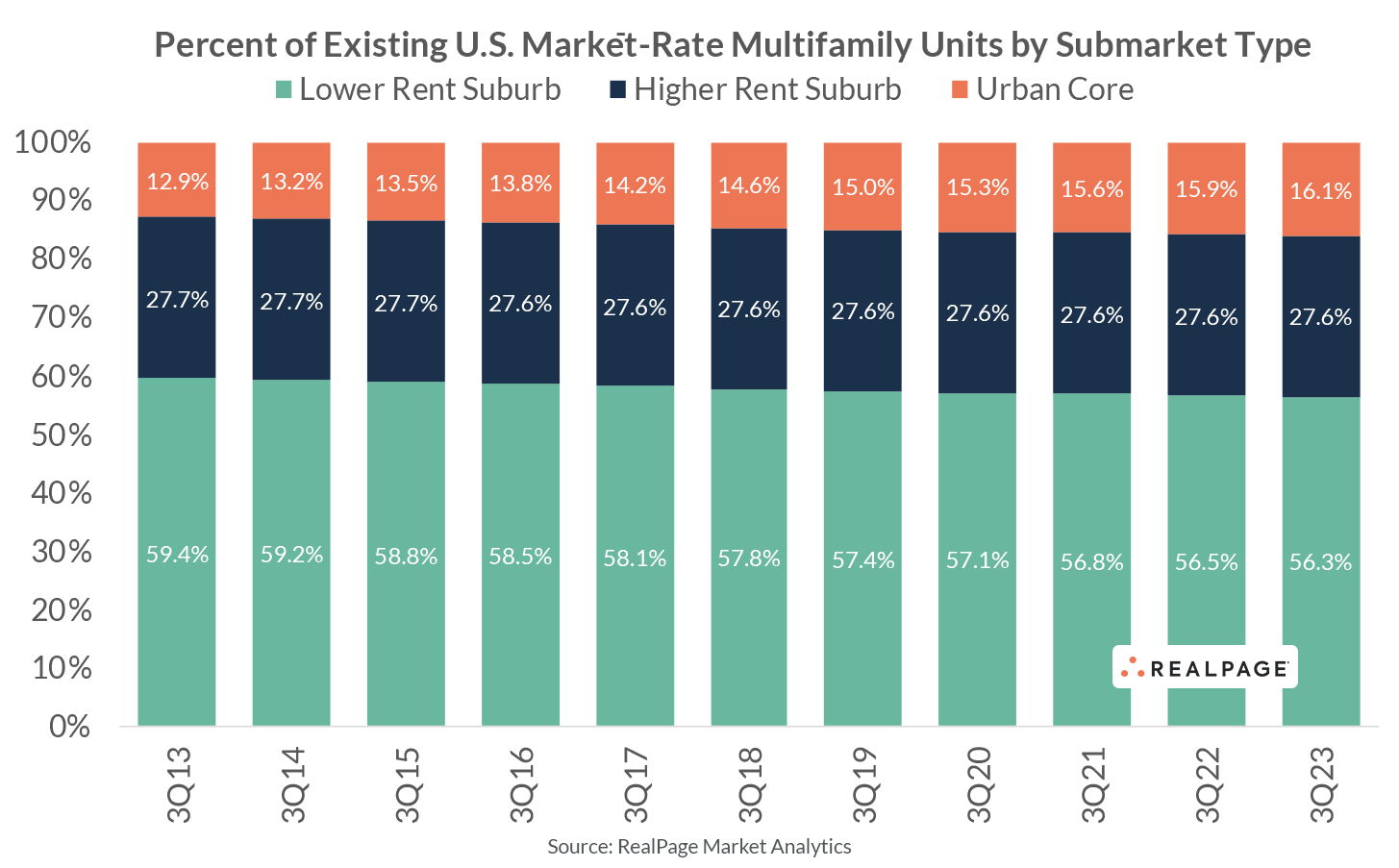 Suburban product with an average effective rent less than the market average makes up more than half of national housing stock among the nation’s top 50 apartment markets, according to RealPage Market Analytics. Low rent suburbs make up about 58% of total existing units over the last decade. Meanwhile, a little more than a quarter of market-rate multifamily housing units are in higher rent suburbs, averaging over 27% in the last decade. Finally, urban cores garner the final fraction of existing units, averaging more like 14.5% over the last decade.