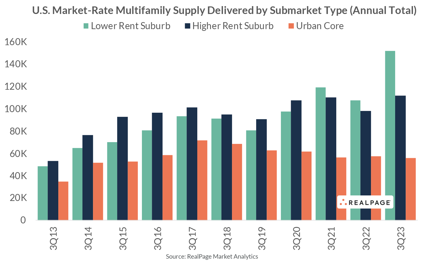 But there has been some recent deviation from that trend. For the first time in at least a decade, the amount of supply delivering in lower rent suburbs is far greater than that of higher rent suburbs. Though this trend began to emerge in 2021 and held through 2022, the 2023 figure shows that close to 50% of market-rate multifamily units delivered to lower rent suburbs.